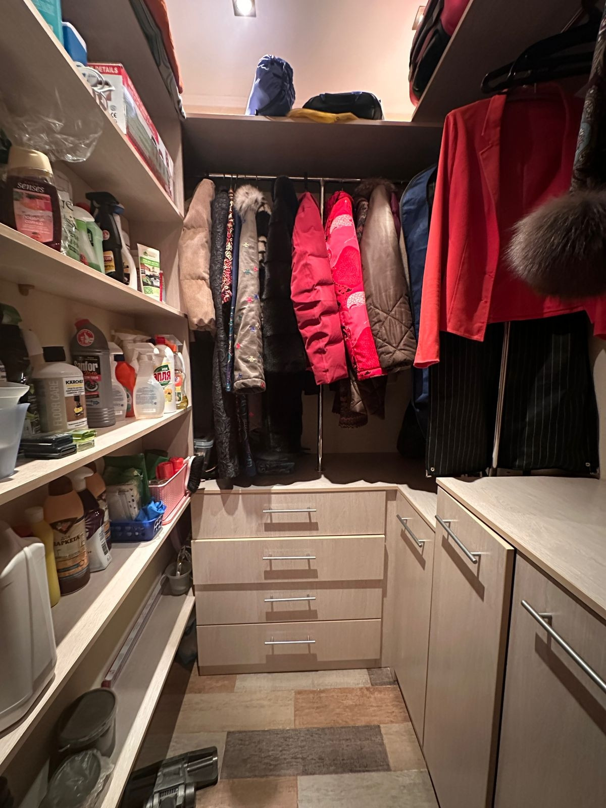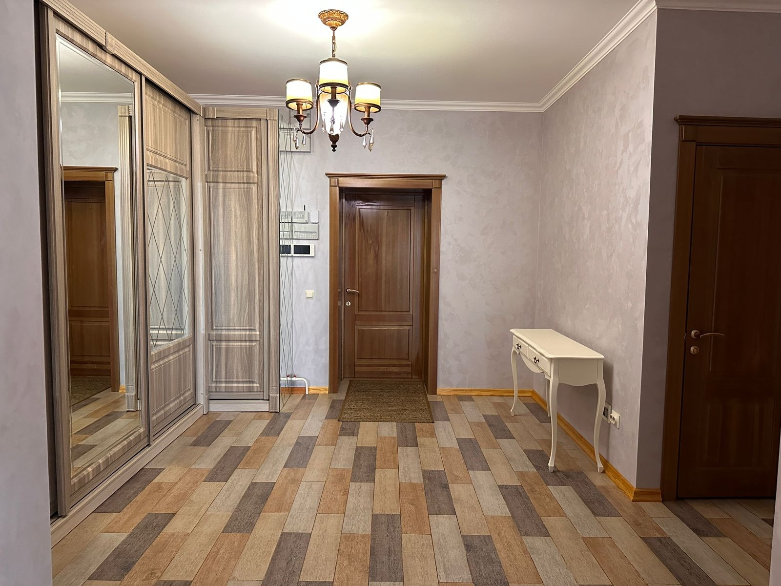 В интерьере прихожей очень привлекательно и современно оформлен дизайн гардеробной, в виде ромбовидного зеркала. Пол с подогревом.
