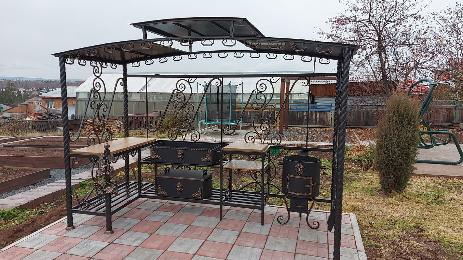 На участке: баня, дровенник, мангальная зона, беседка, детский батут, качели, 2 теплицы, парник.
