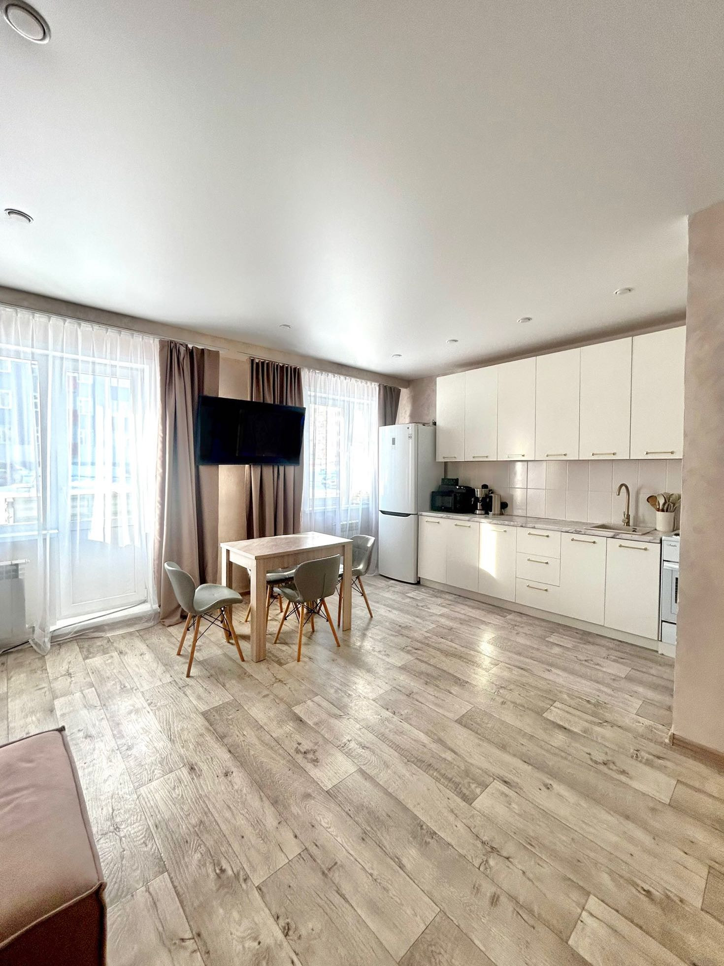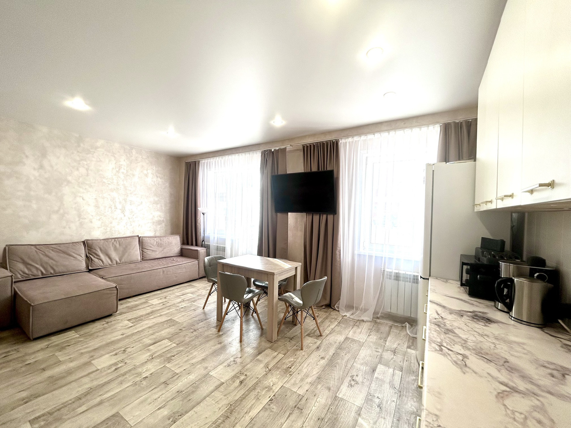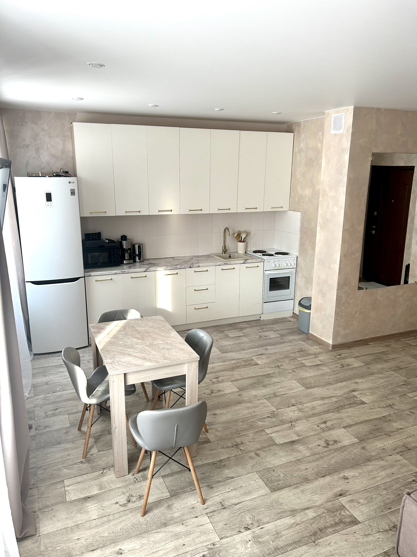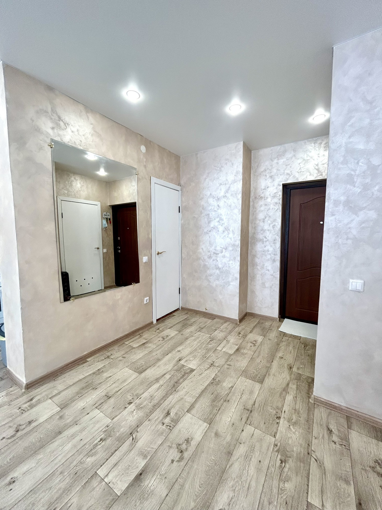 На стенах декоративная штукатурка, натяжной потолок, новые теплые полы.