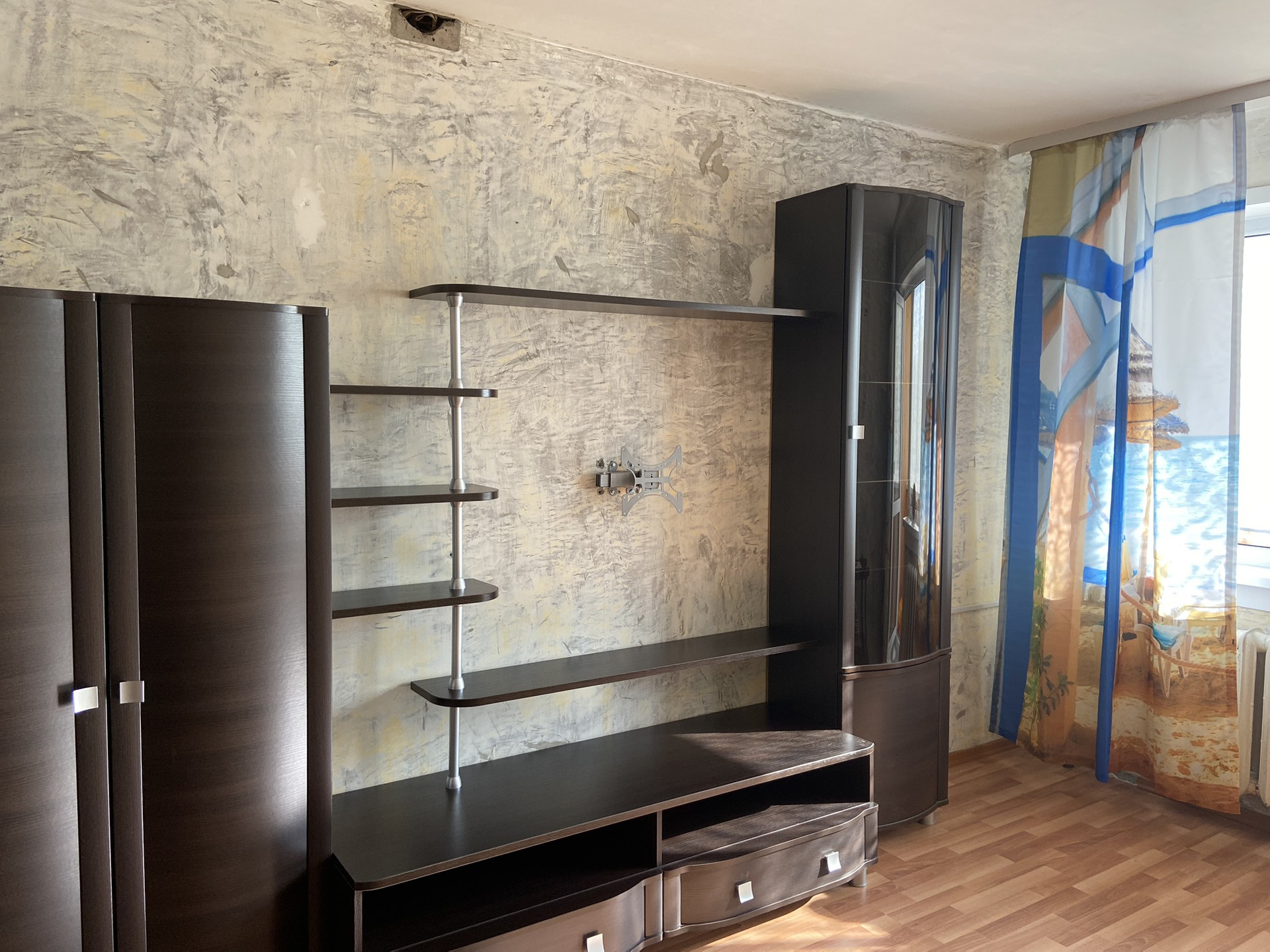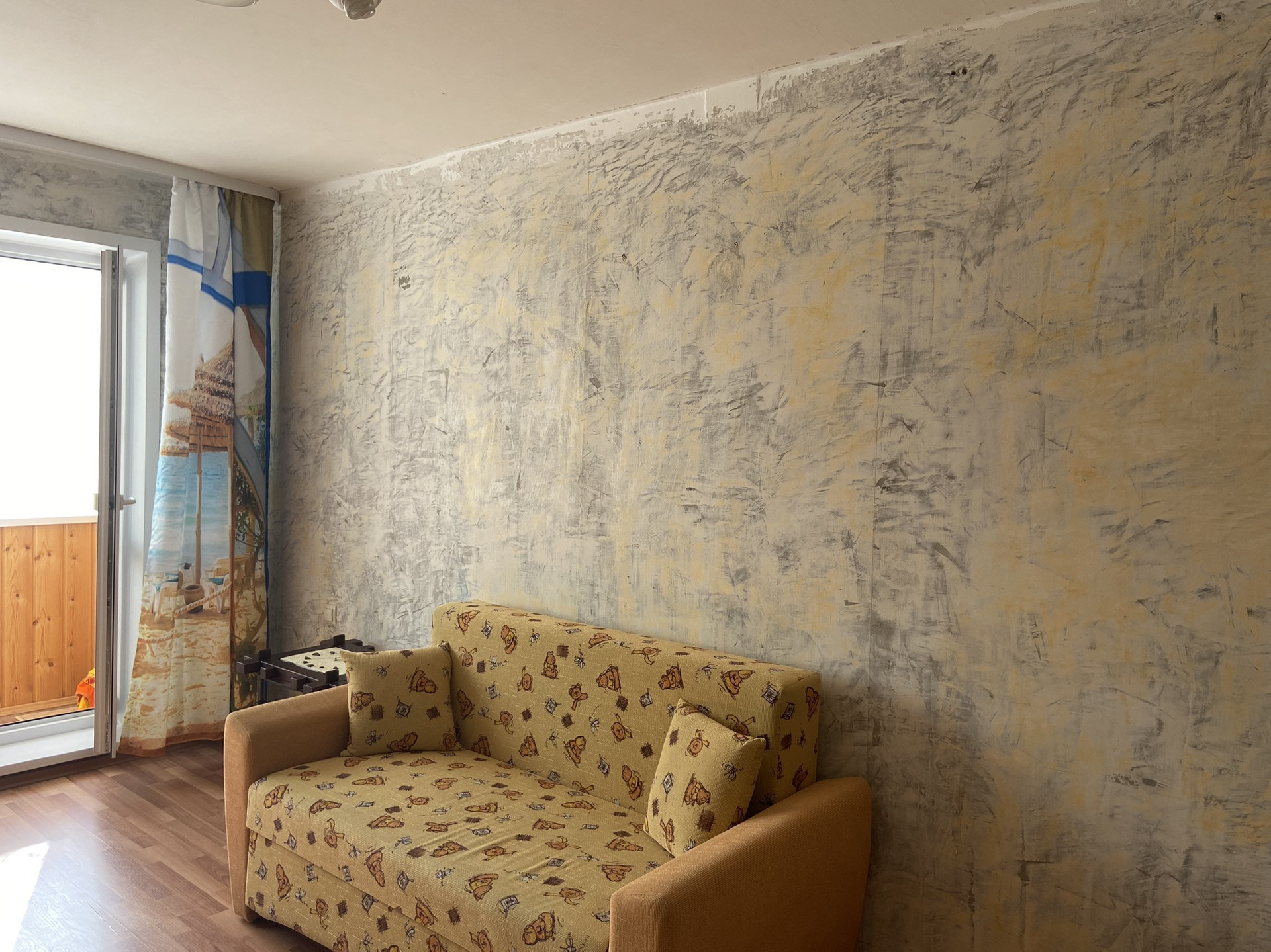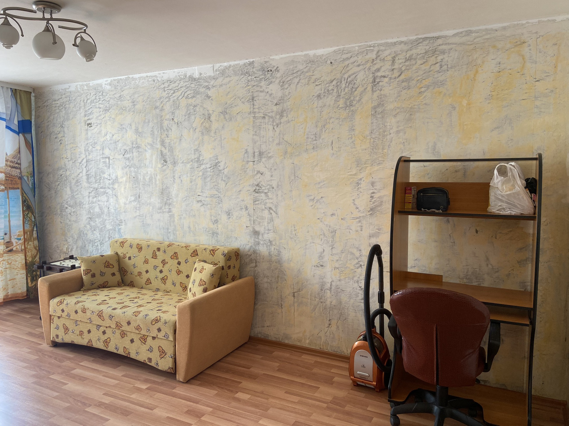 ЗАЛ: замена окна, на полу ламинат, стены подготовлены под оклейку обоями. Солнечная сторона.