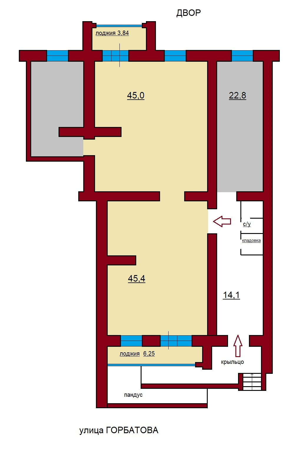 Крыльцо и 2 окна выходят на улицу Горбатова, 2 окна - во двор.