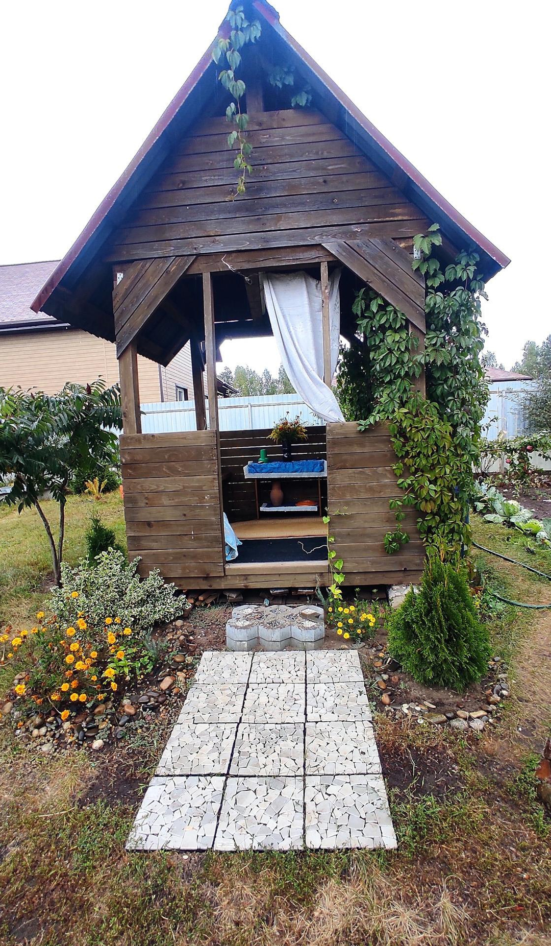 Есть место для отдыха- прекрасная уютная деревянная беседка и зона отдыха- с шезлонгом, новый интерьерный очаг порадует Вас своим теплом.