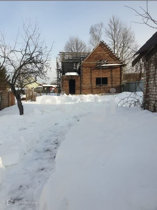 Недостроенный дом из бревна на бетонном фундаменте, с одной стороны установлено пластиковое окно, а также в перспективе есть второй этаж.