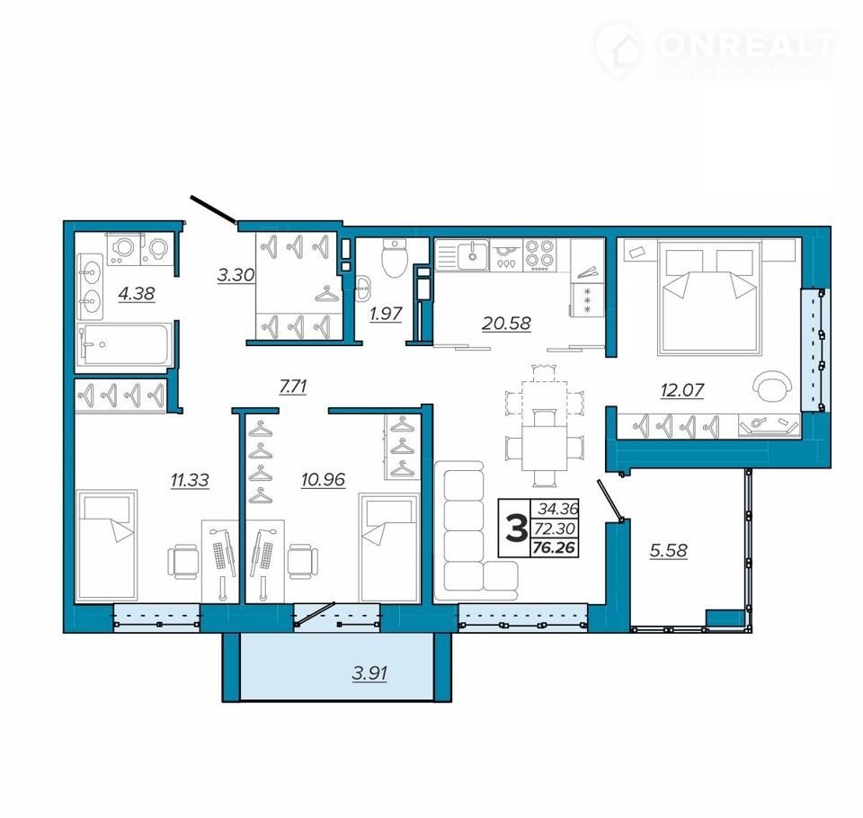 - 3 Спальня 11.33 м2