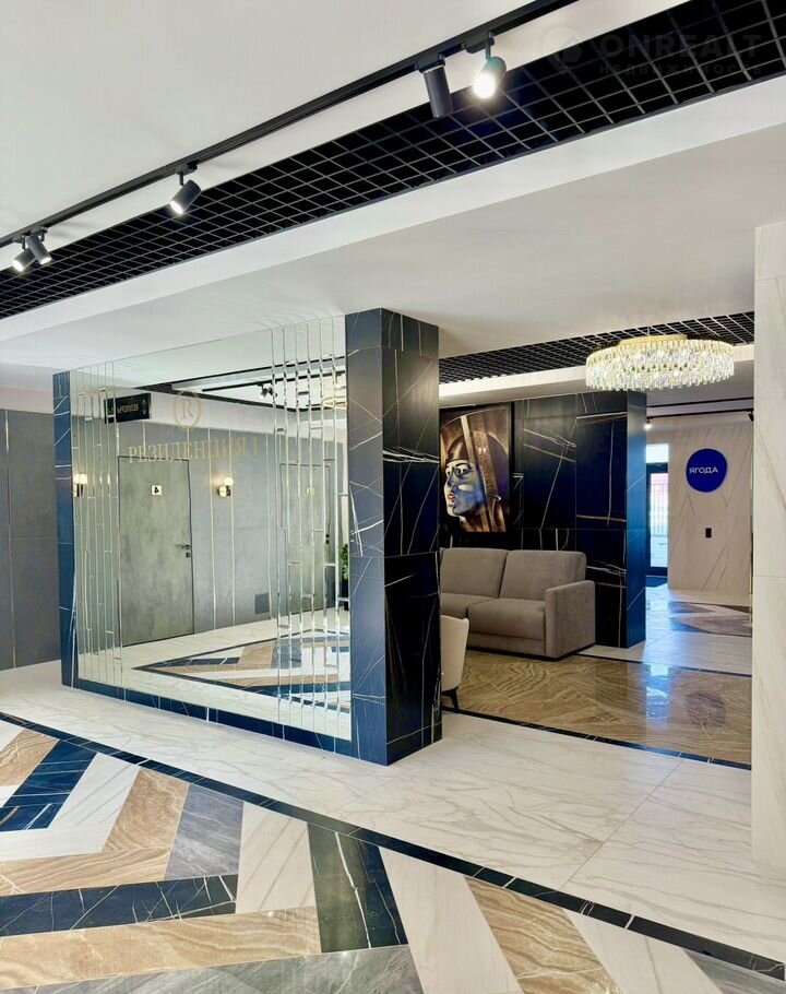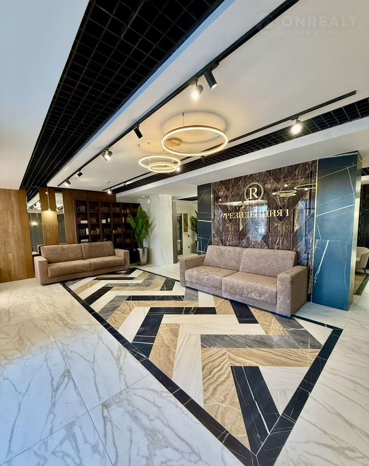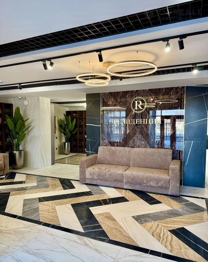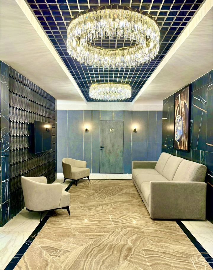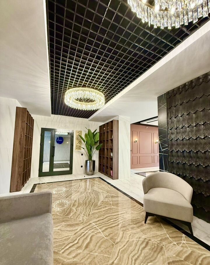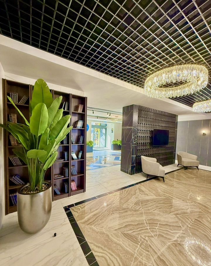 На первом этаже расположен просторный холл с зоной ресепшн. Отделка холла выполнена по индивидуальному дизайн-проекту с использованием премиальных материалов.