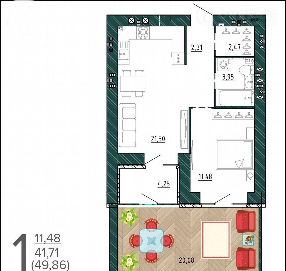В продаже однокомнатная квартира с террасой.