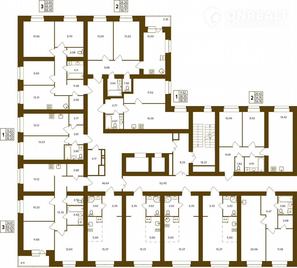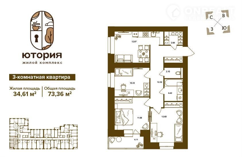 3-комнатная квартира, 73.4 м2, этаж 14 / 16, на продажу в Брянске, Степная улица, уч2Б
