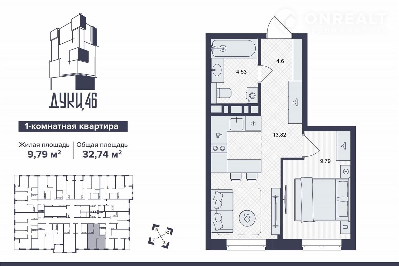 1-комнатная квартира, 32.7 м2, этаж 7 / 16, на продажу в Брянске, улица Дуки, 46