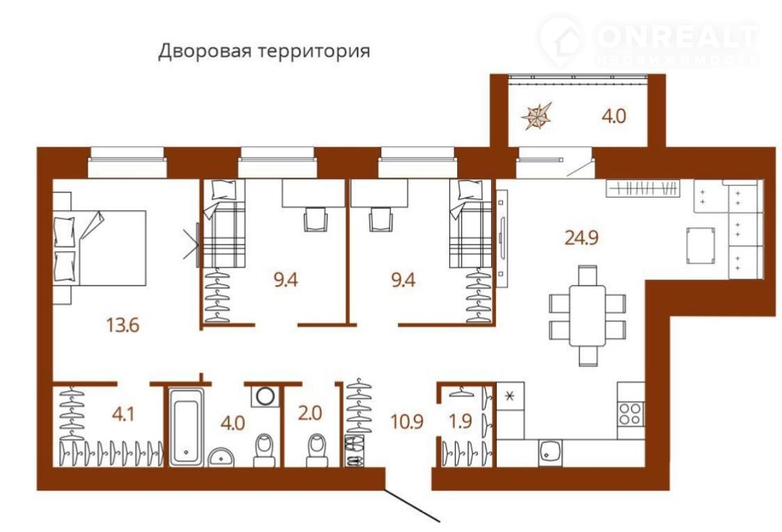 Площадь кухни 24.9 м2