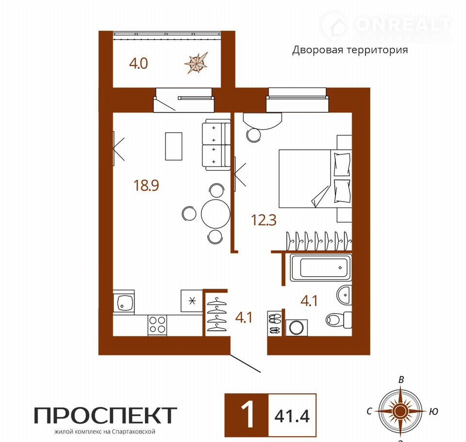 Общая площадь 41.4 м2
