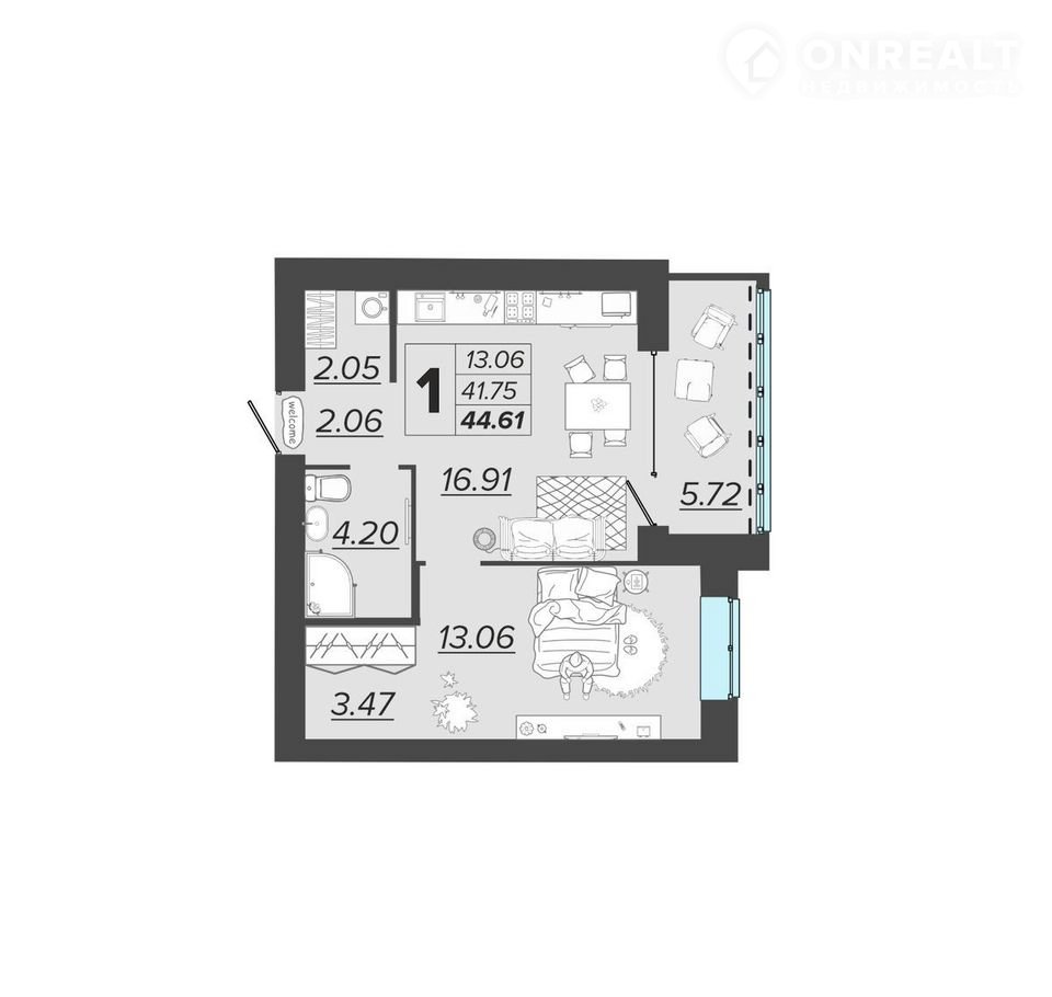 Общая площадь 44.6 м2
