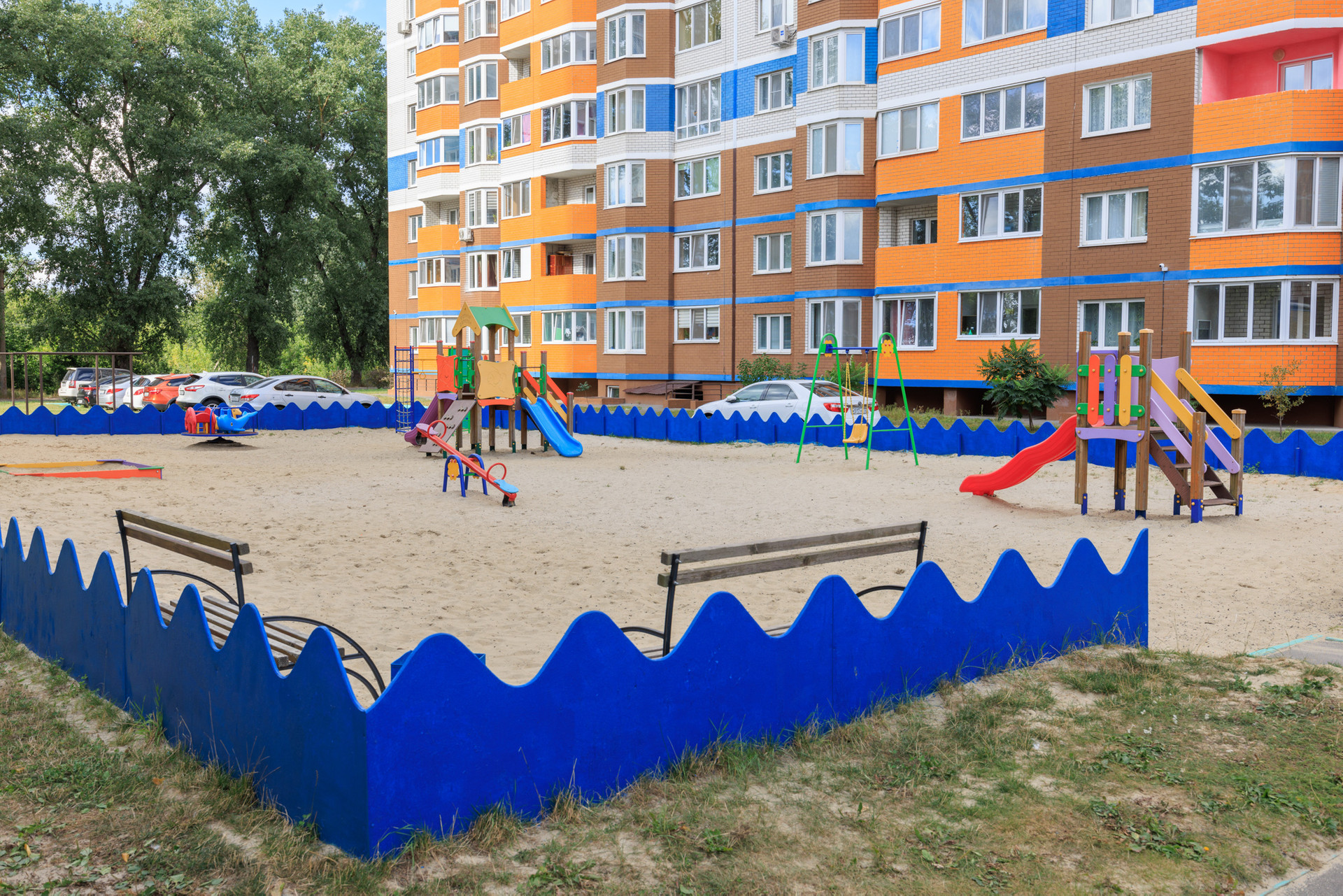 Вокруг дома территория с парковочными местами, во дворе - детская игровая площадка.