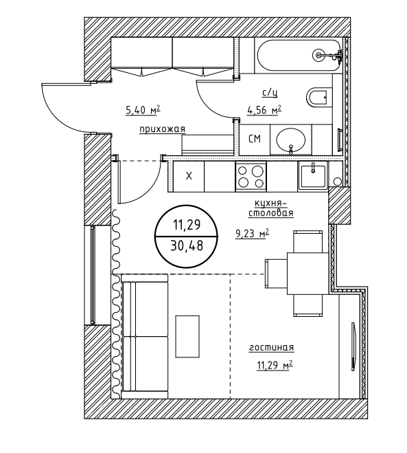 Общая площадь 30.48 м2