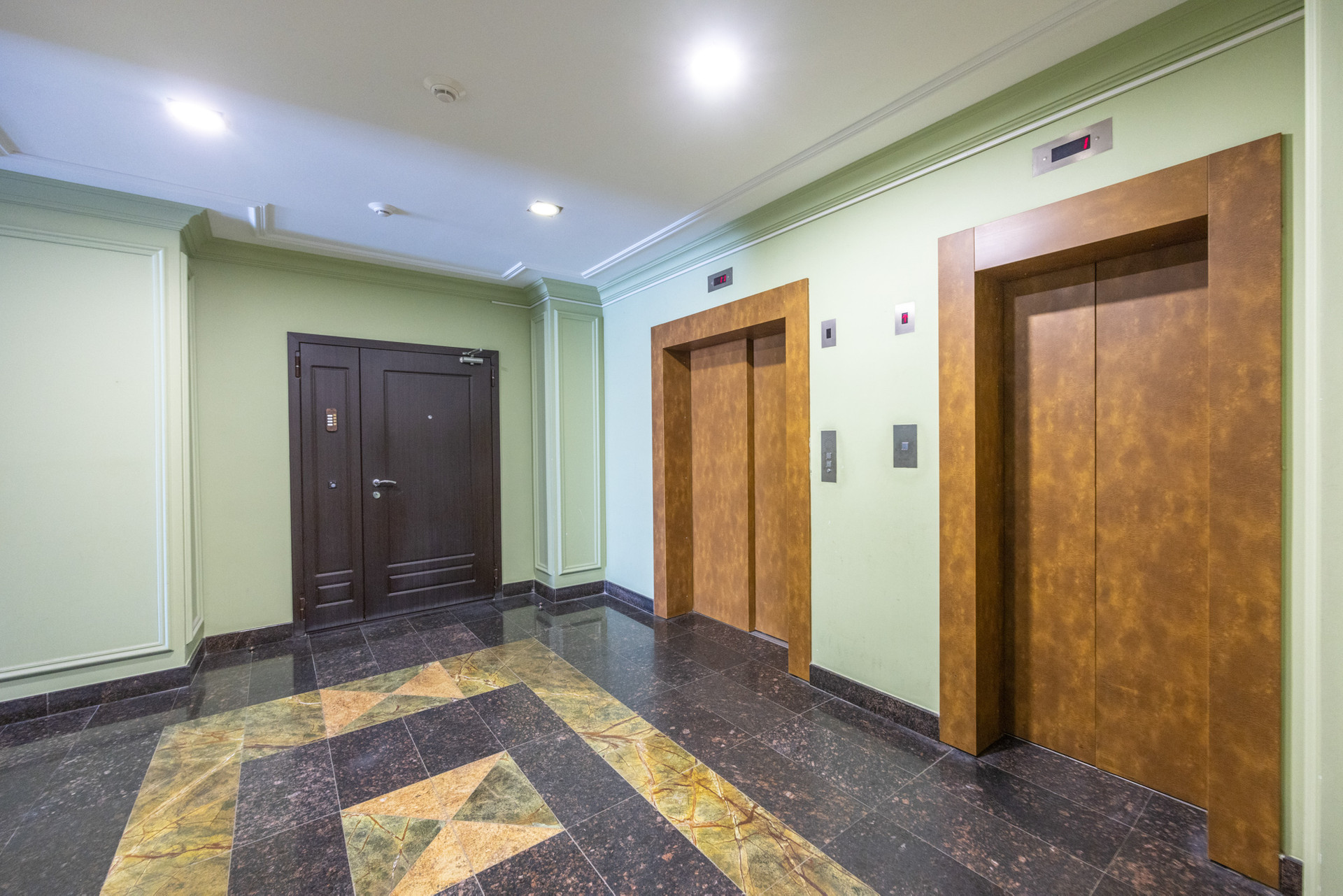 Эксклюзивное дизайнерское оформление холла, который представлен кожаными диванами, ковровыми дорожками и панно из индийского зелёного мрамора Bidasar Green.