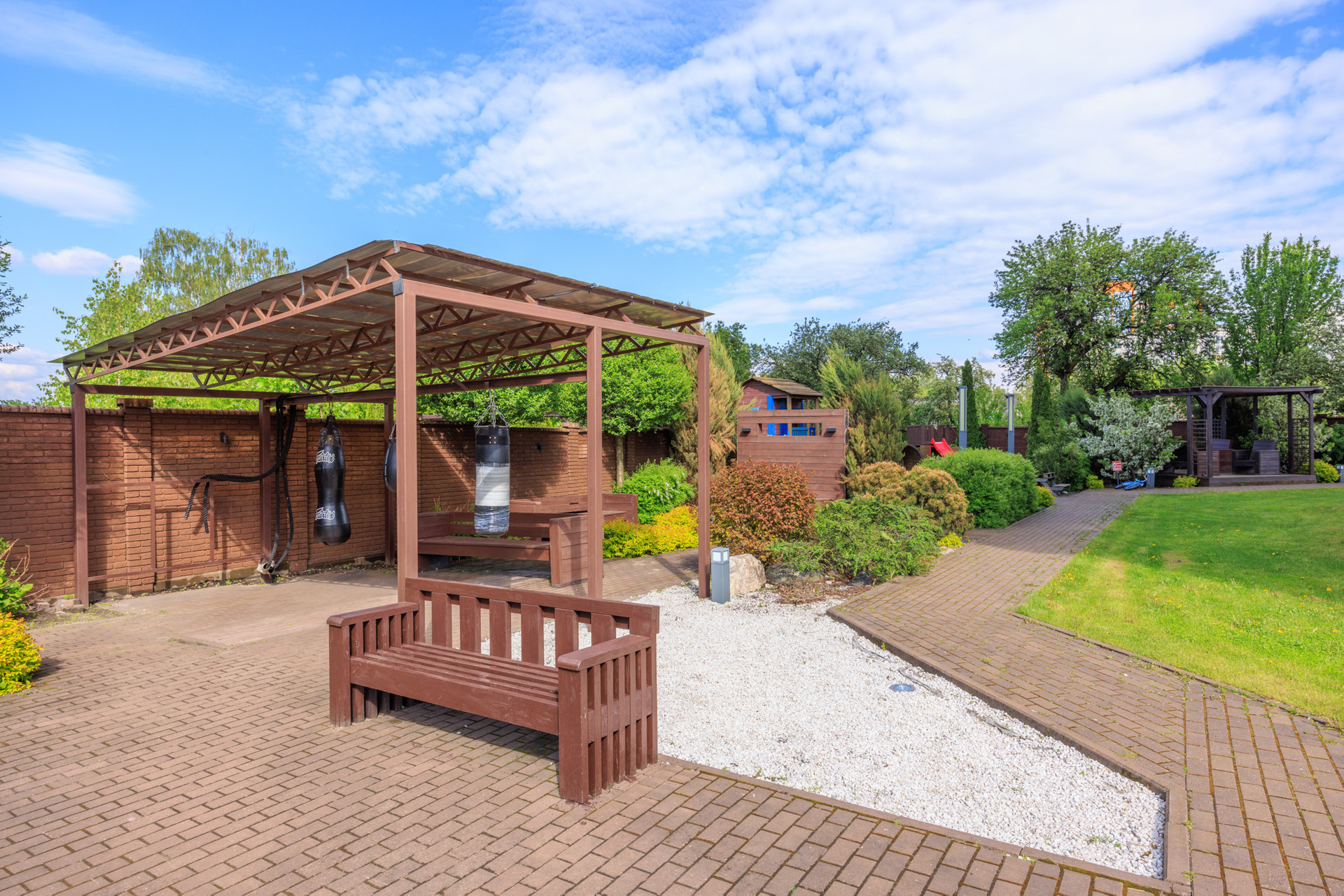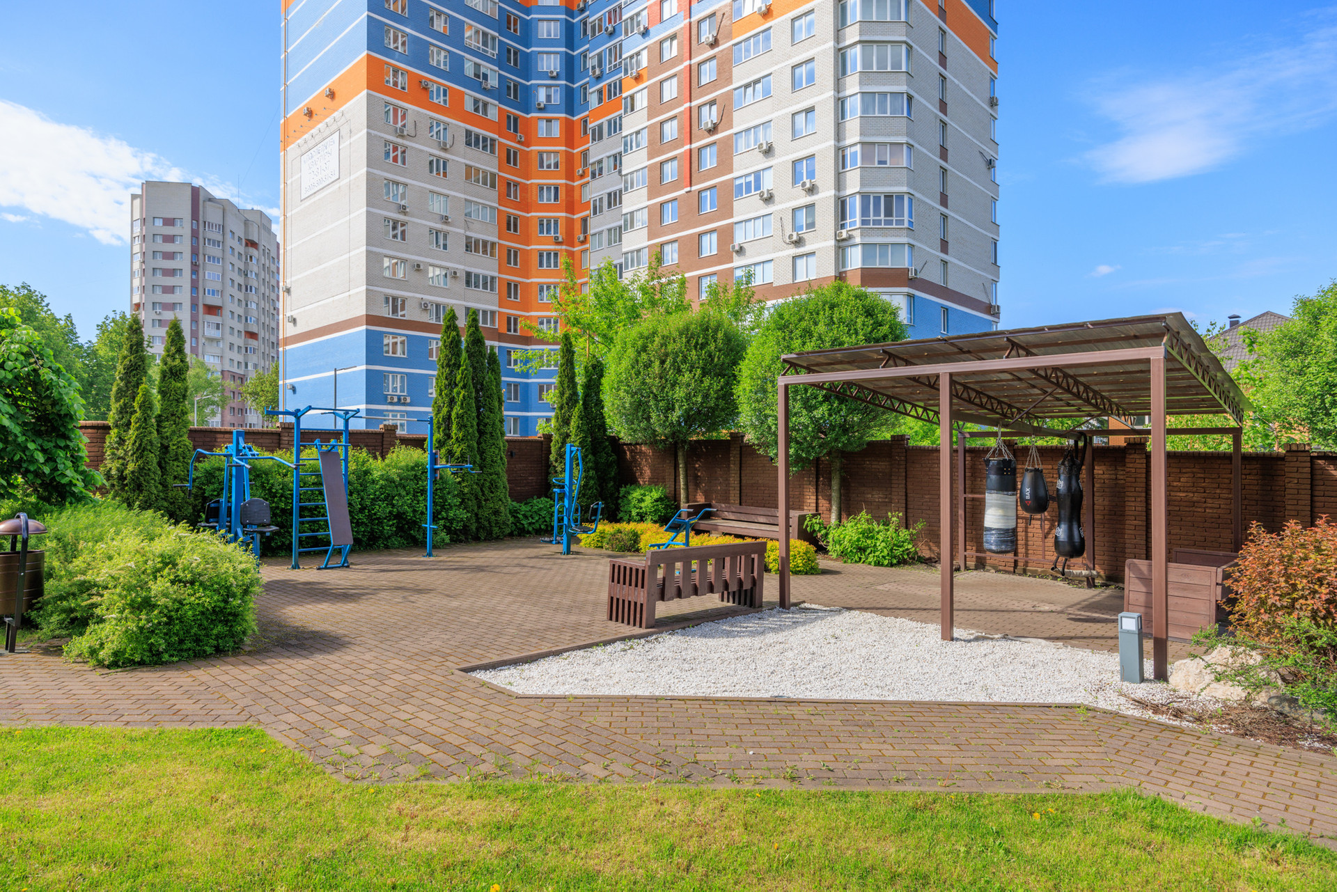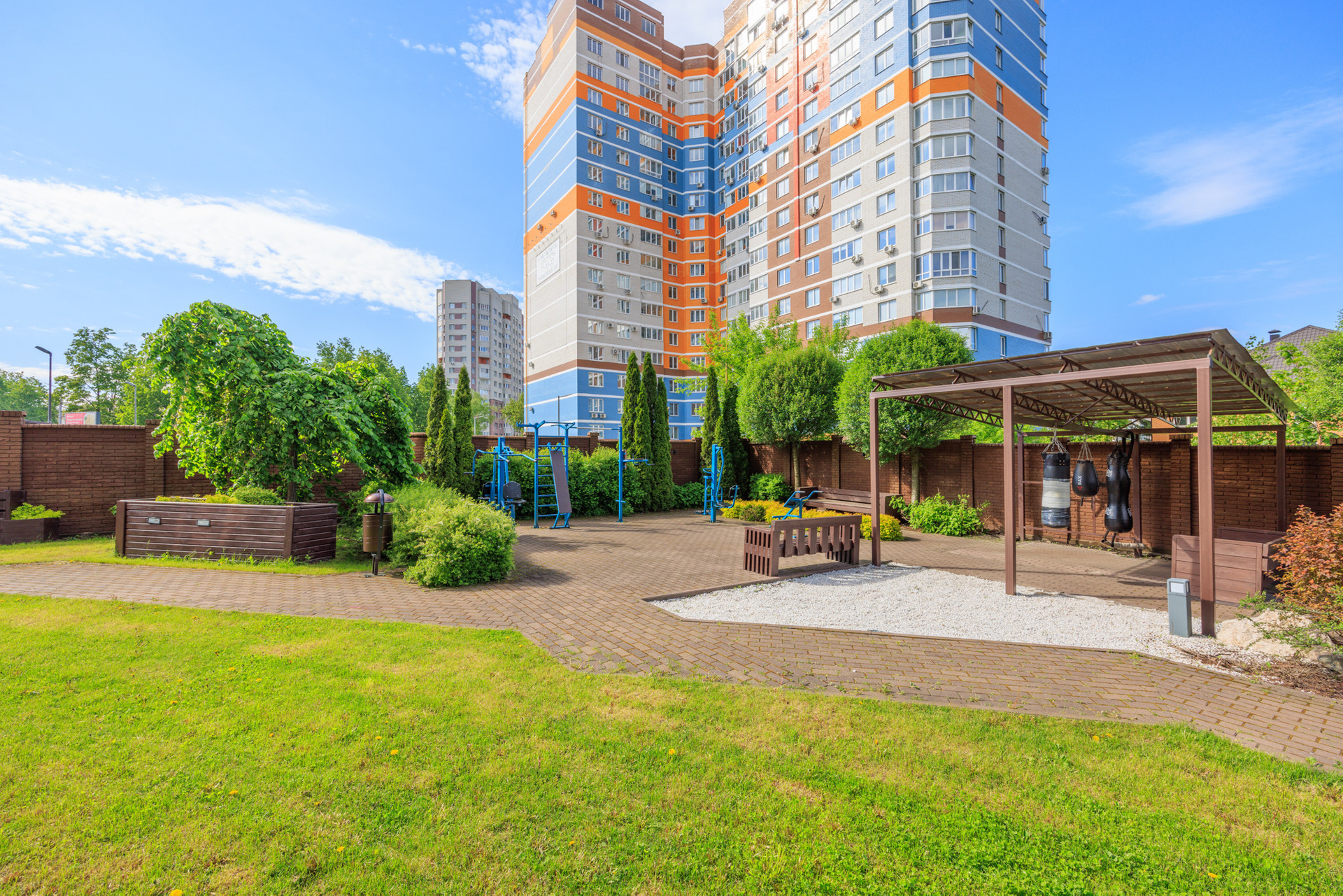 В беседке можно привести мысли в порядок и провести время с друзьями на свежем воздухе, а уютные скамейки отлично подходят для чтения книг. Воркаут площадка во дворе позволит поддерживать себя в спортивной форме. Детская площадка имеет мягкое покрытие, что позволяет ребёнку комфортно проводить время, играя с друзьями, а родителям быть спокойными за его безопасность.