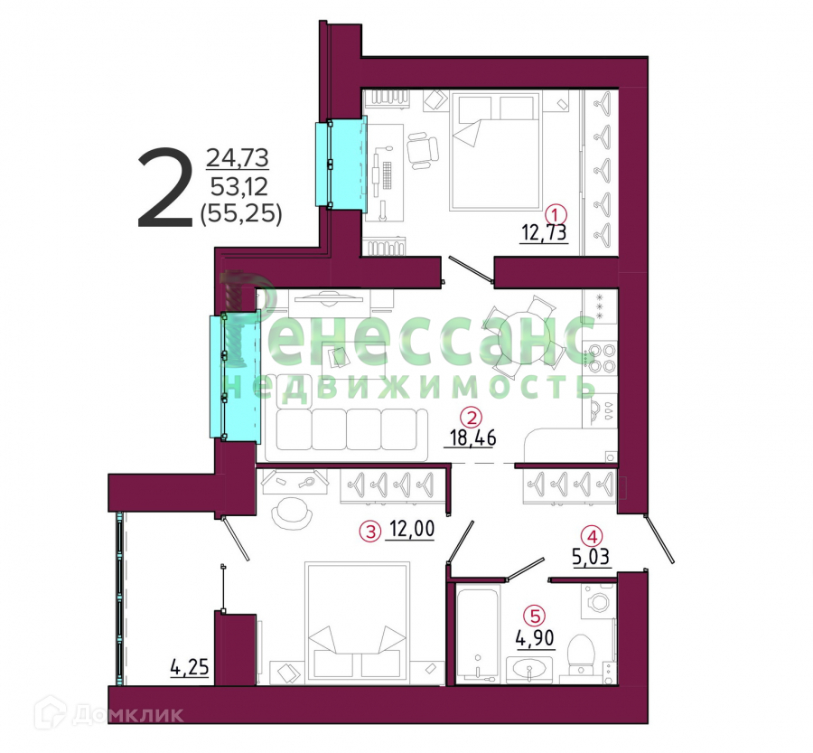 ✔ Квартира не угловая, кухня-гостиная 18 кв.м + две изолированные комнаты