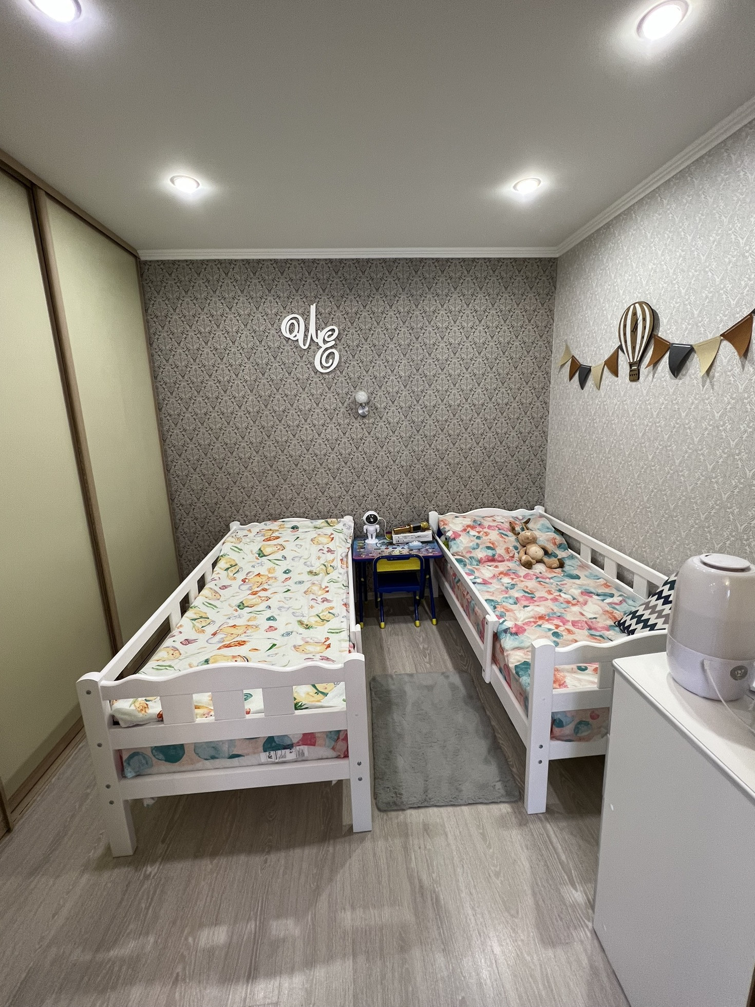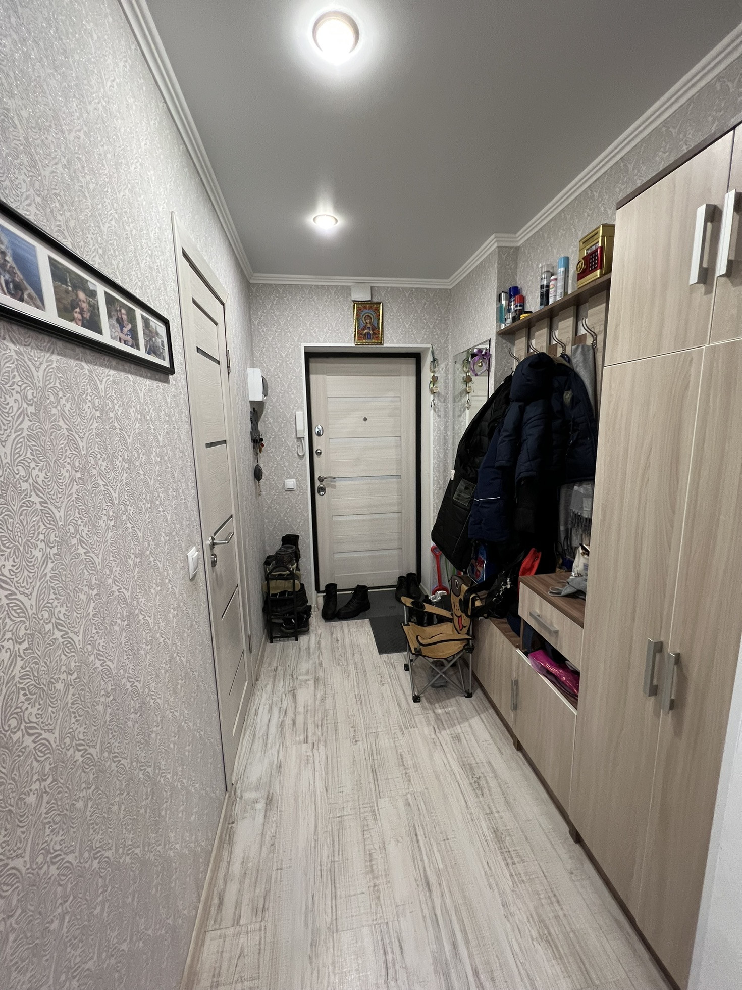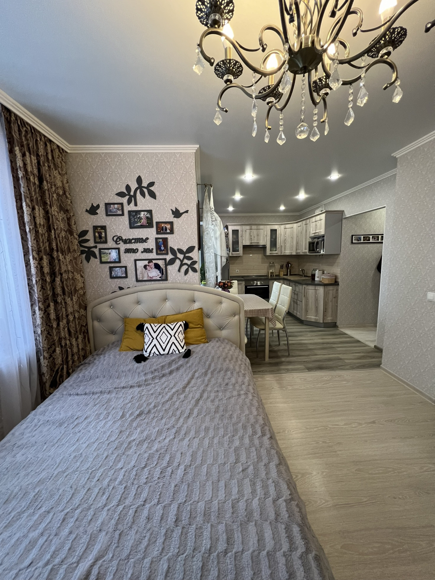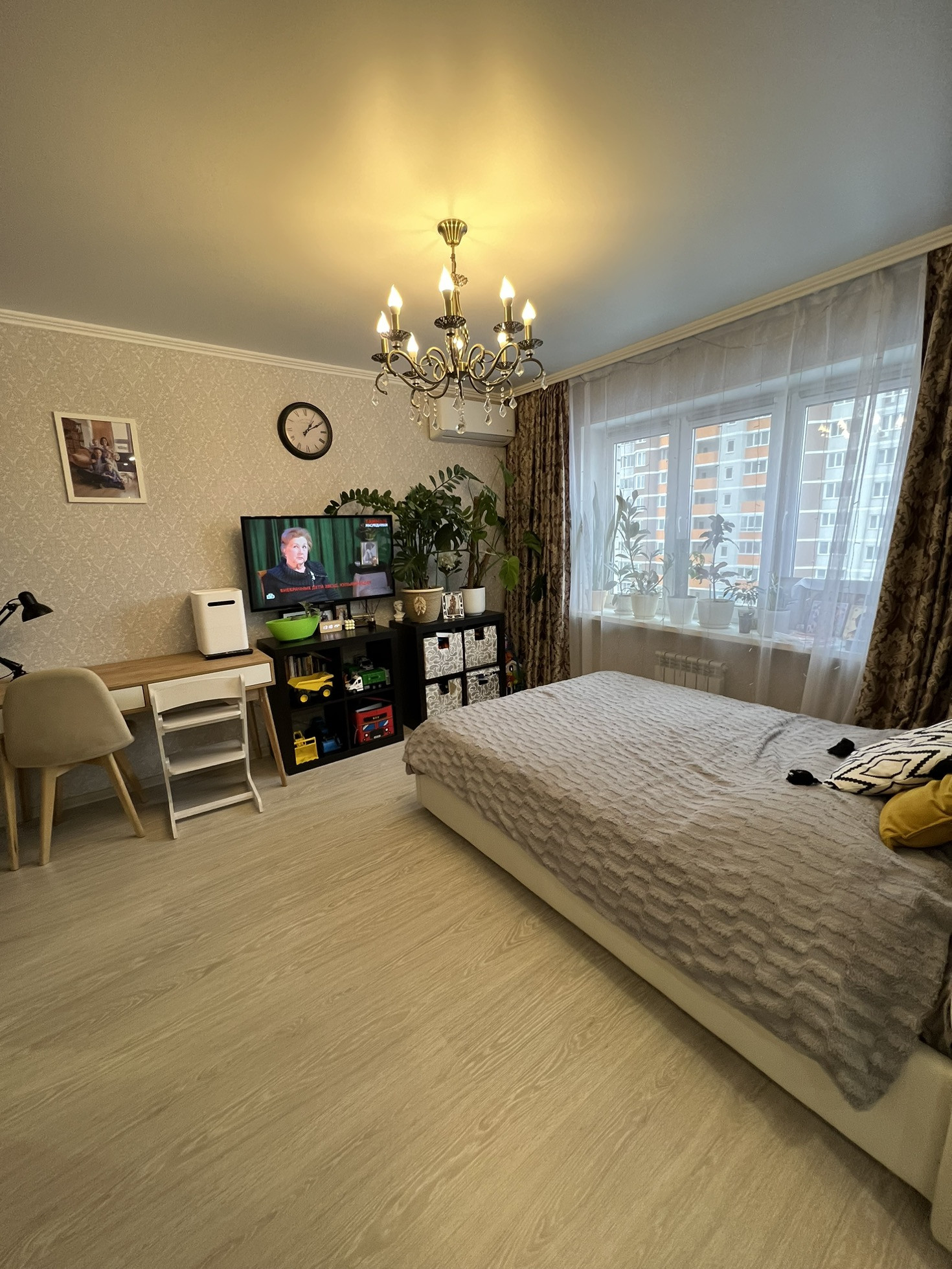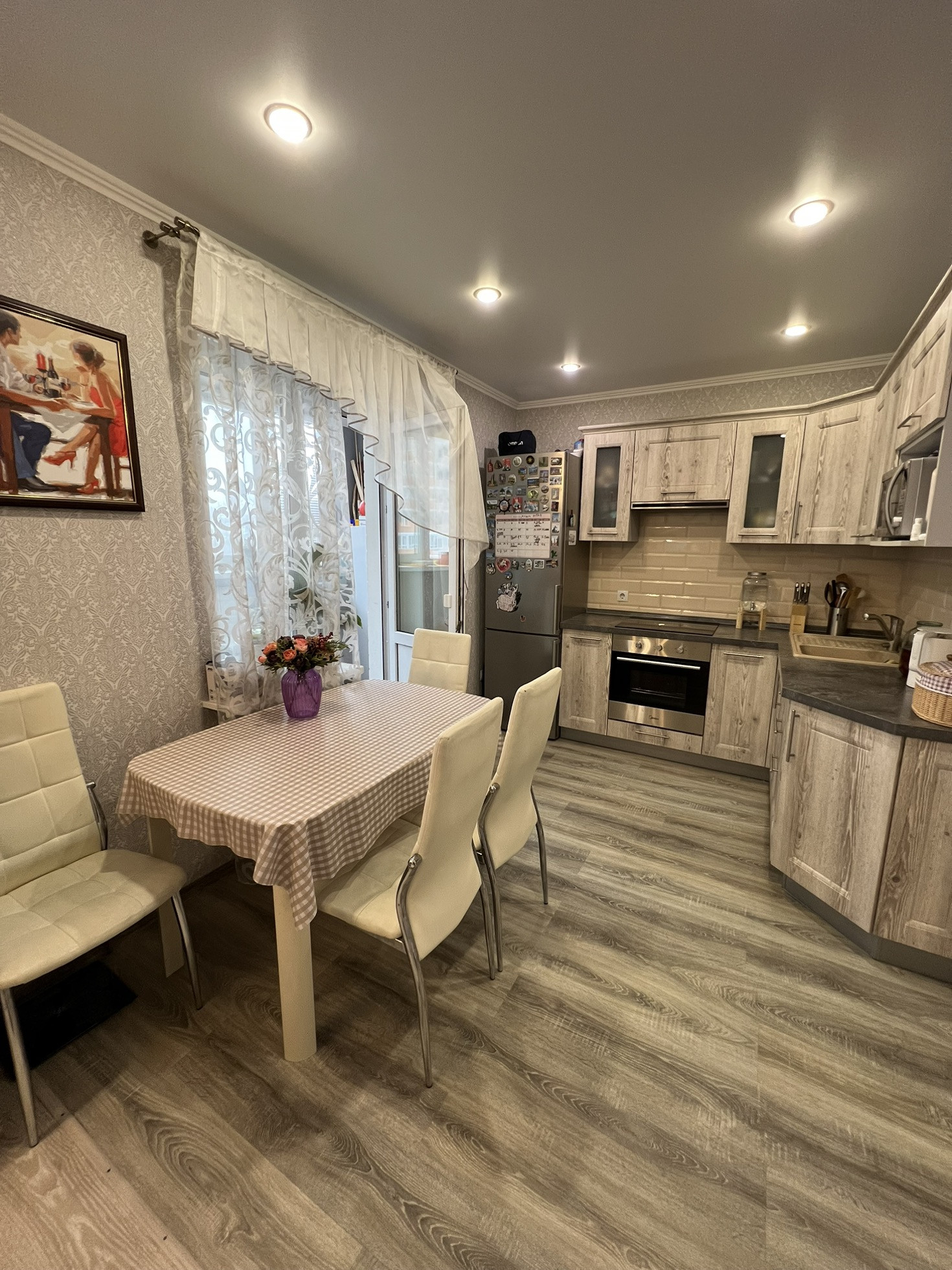Произведено удобное зонирование квартиры, тем самым выделена детская комната с огромной гардеробной. Натяжные потолки, на полу ламинат, в санузле плитка, балкон остеклен. Частично остаётся мебель, встроенная кухня с духовым шкафом и варочный панелью.