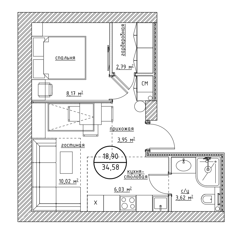 Общая площадь 34.58 м2