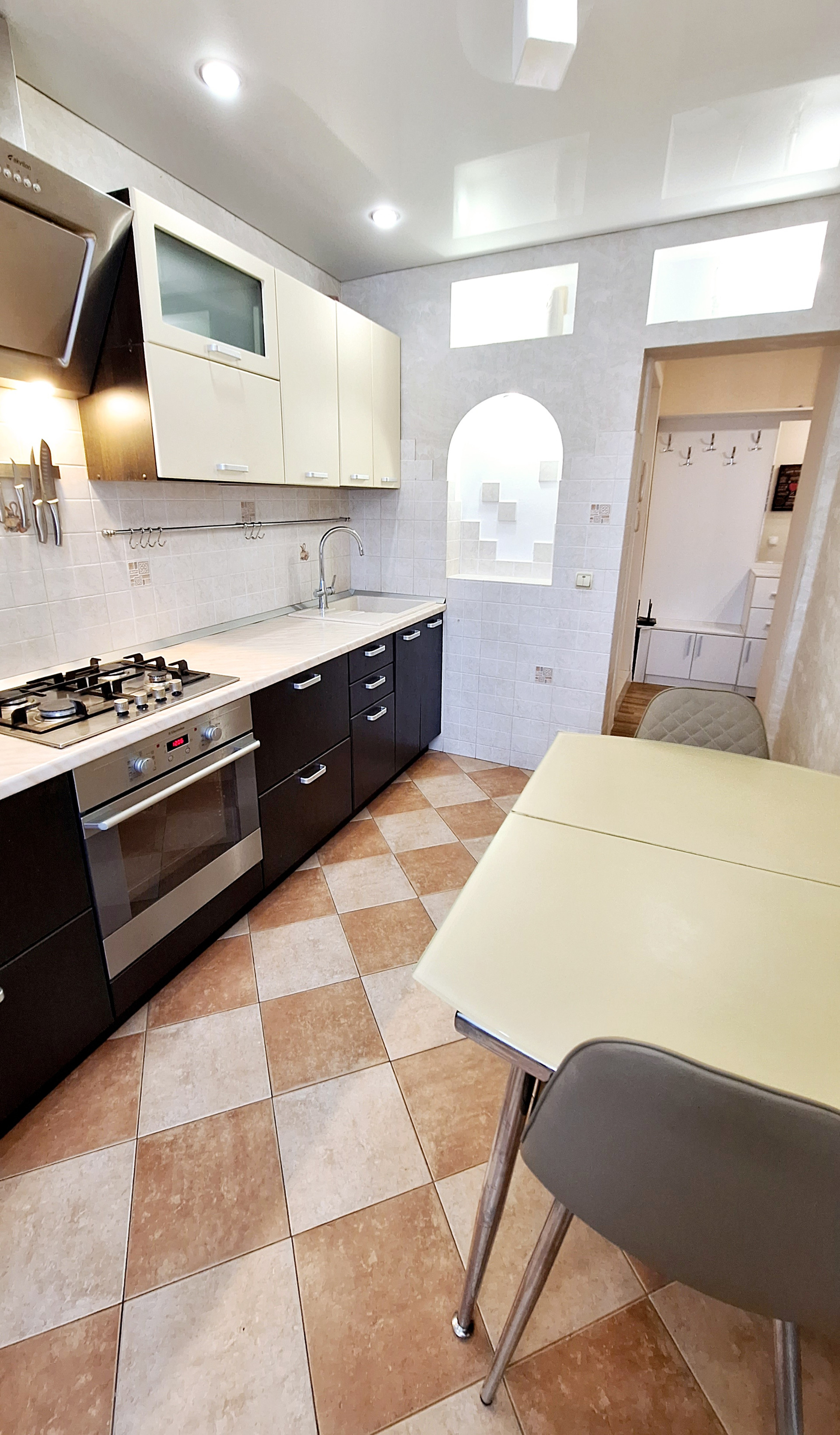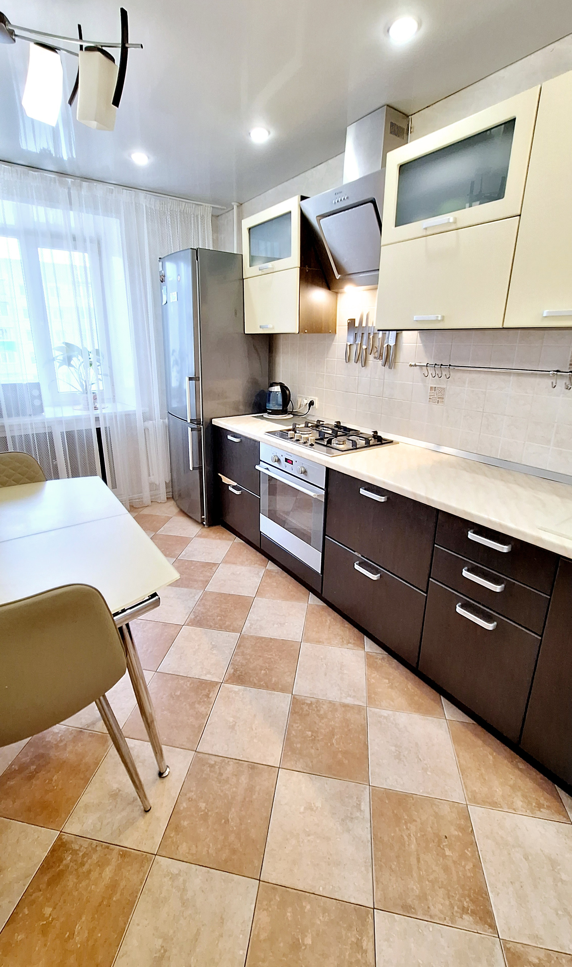 Современная планиpовкa: три cветлые,изолированные комнаты- 16,8 кв.м., 10,2 кв.м. и 9,8 кв.м.; просторная кухня - 8,9 кв.м.; вместительная прихожая - 7,4 кв.м.;  санузел совмещен- 4,7 кв.м.; 2 застекленные лоджии.Натяжные потолки, пол- линолиум(новая стяжка), стеклопакеты. Окна выходят на 2е стороны: северо-восточную сторону до обеда, юго-западную сторону после обеда.