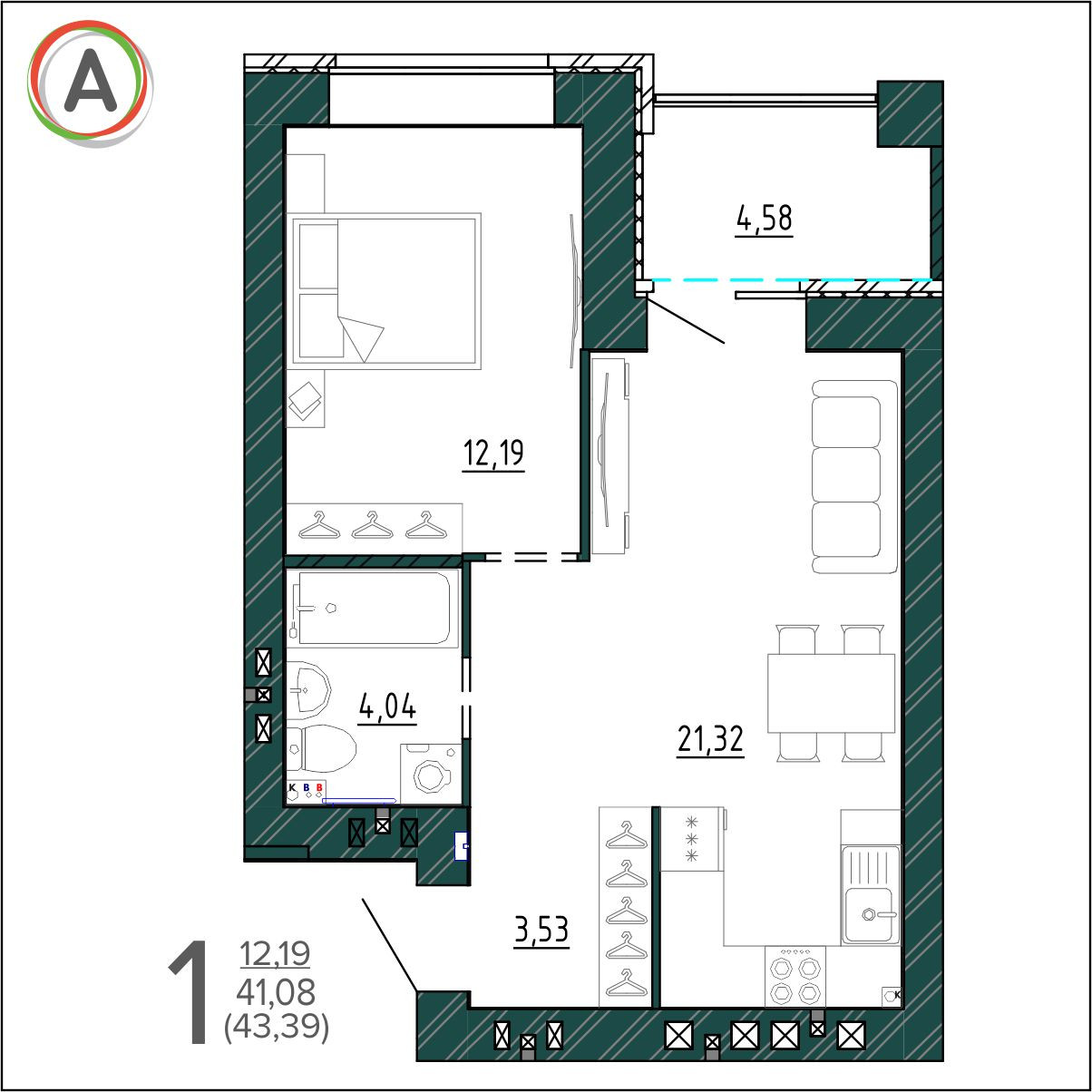Общая площадь 43.39 м2
