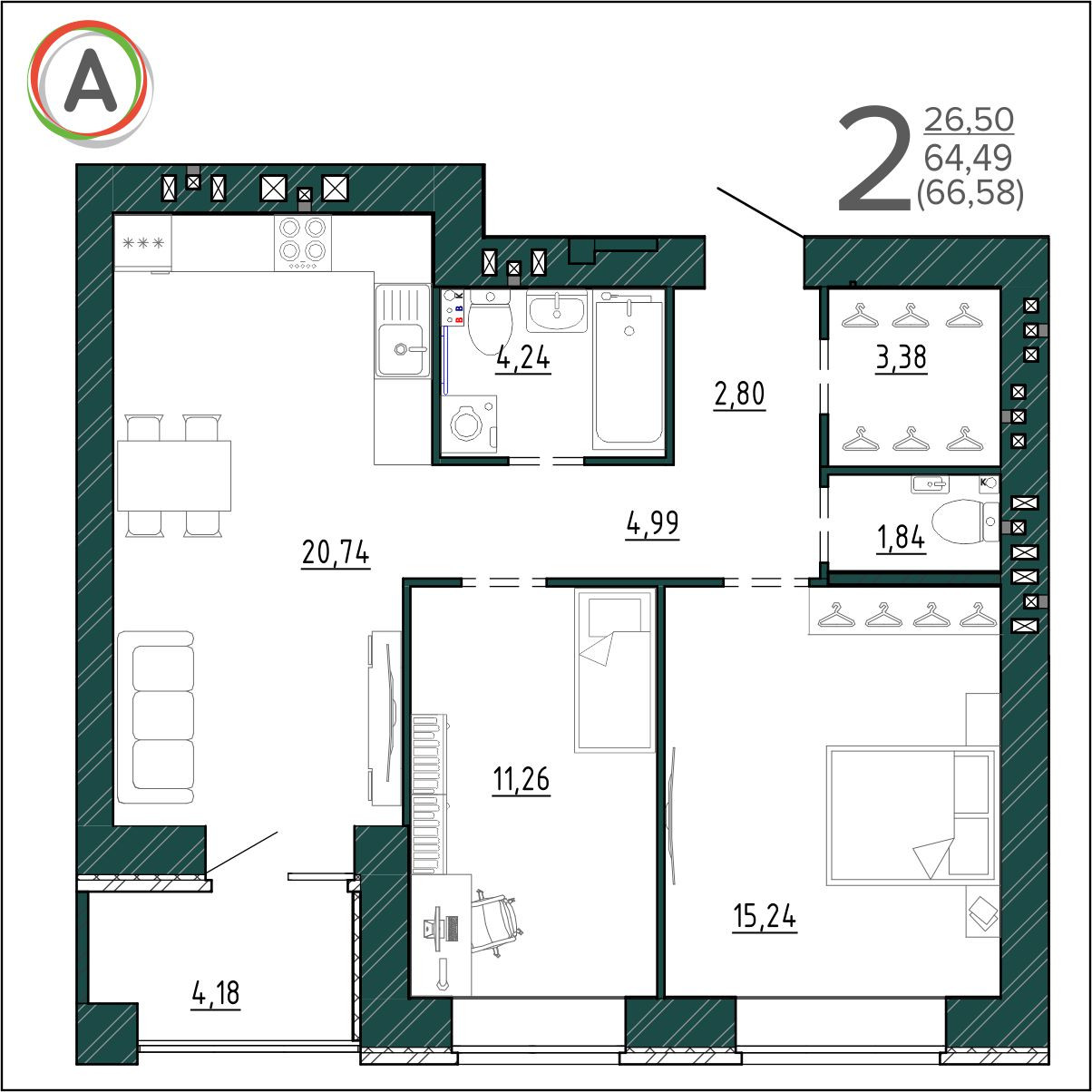 Общая площадь 66.58 м2