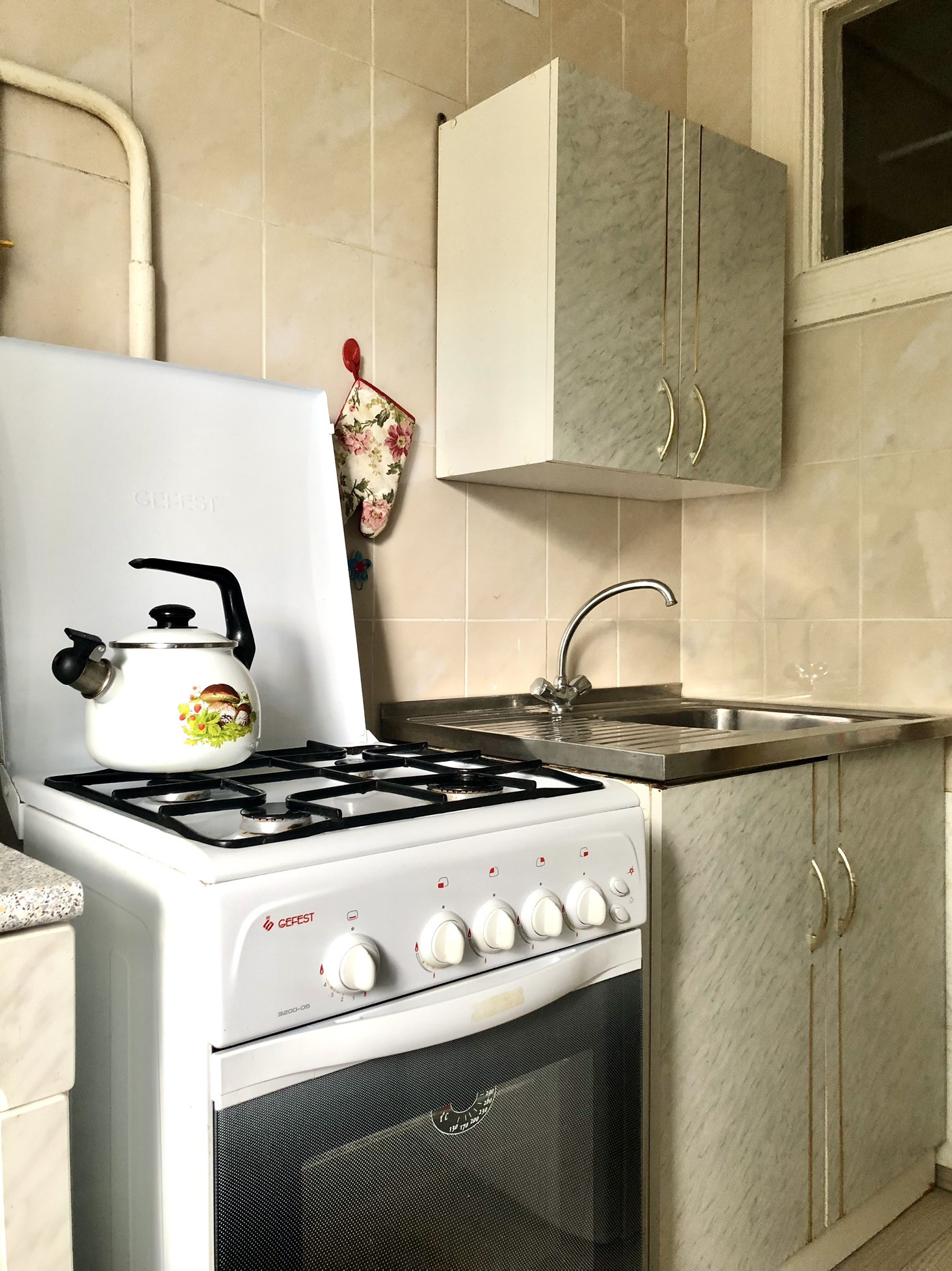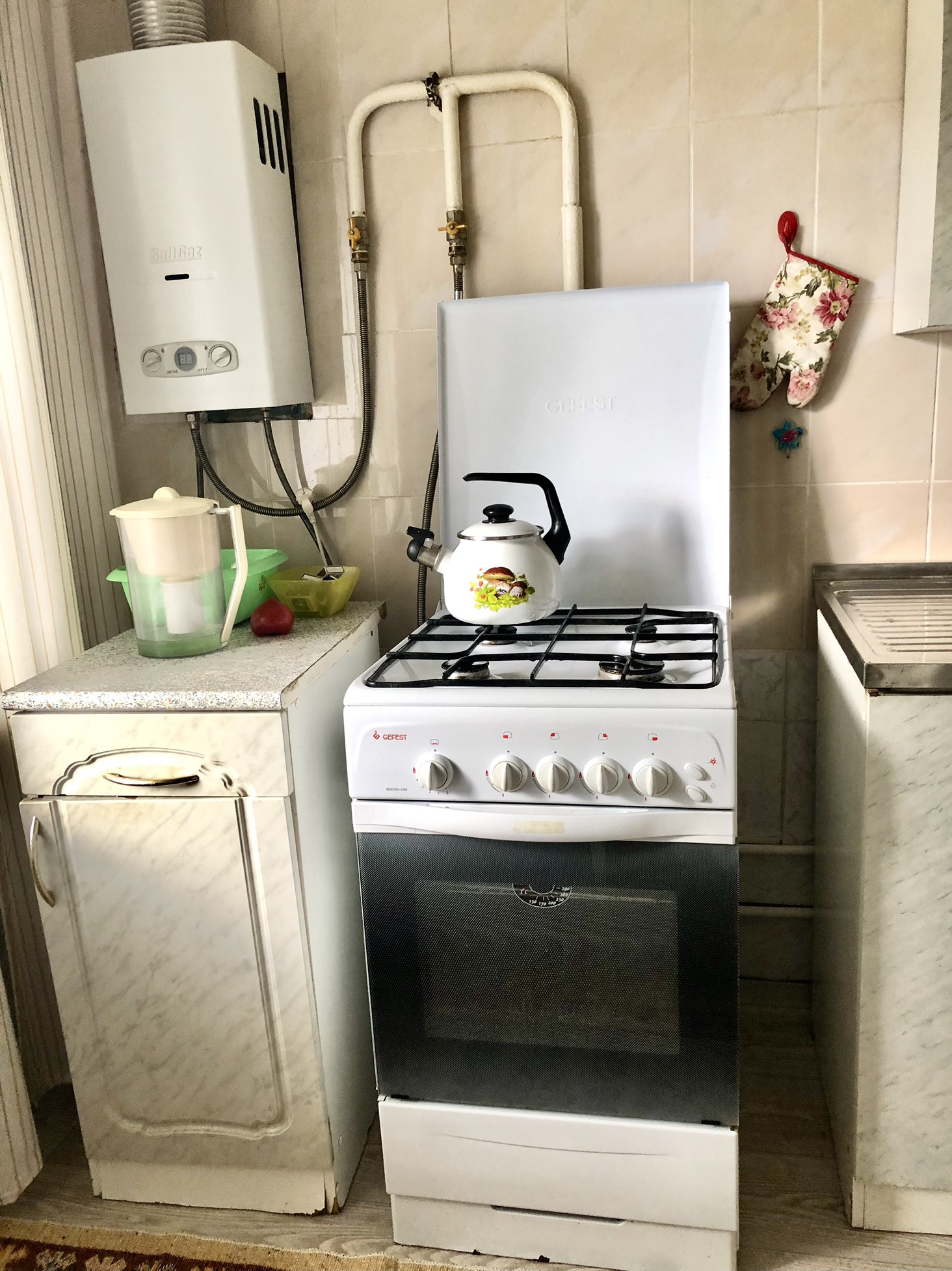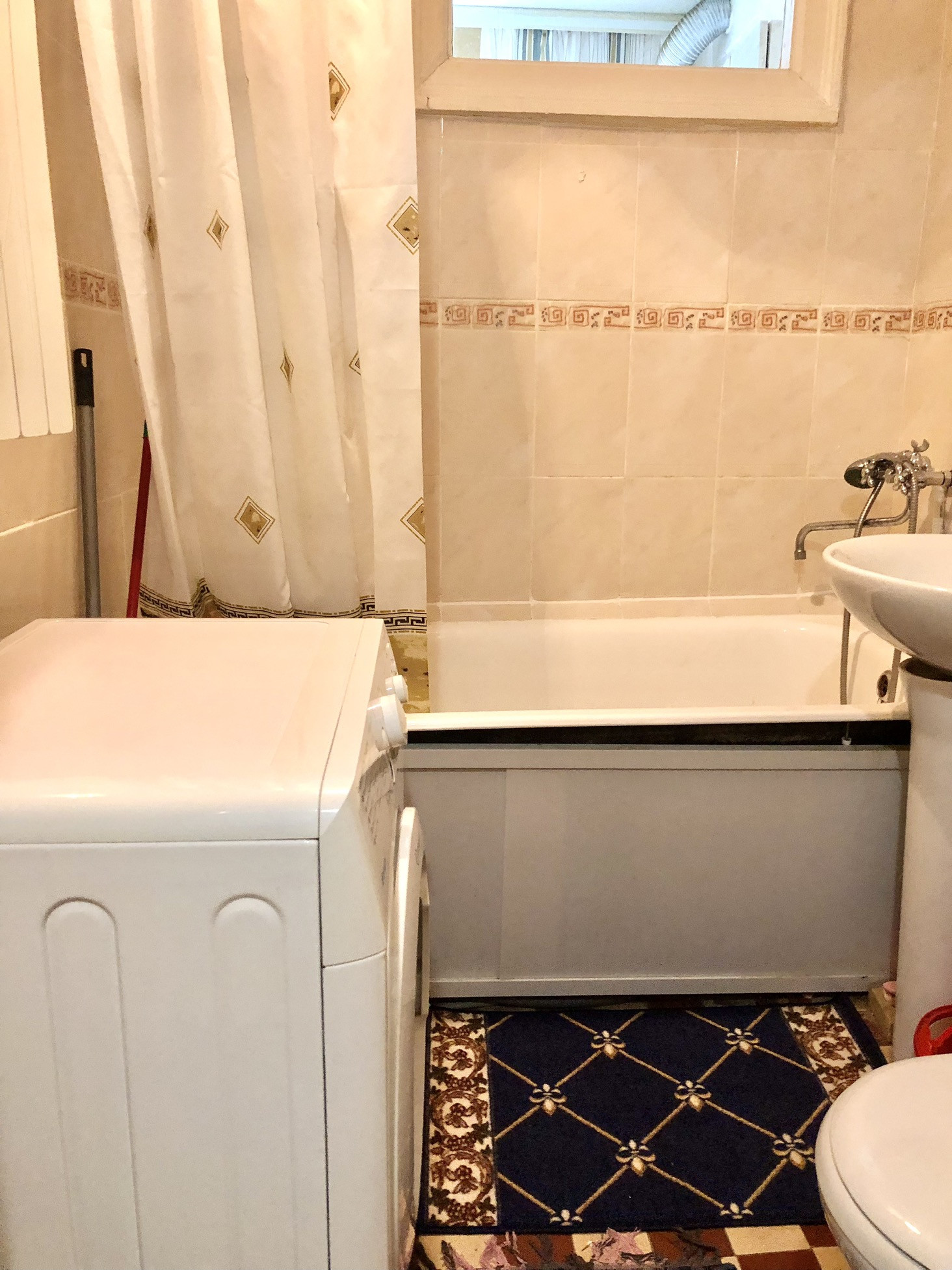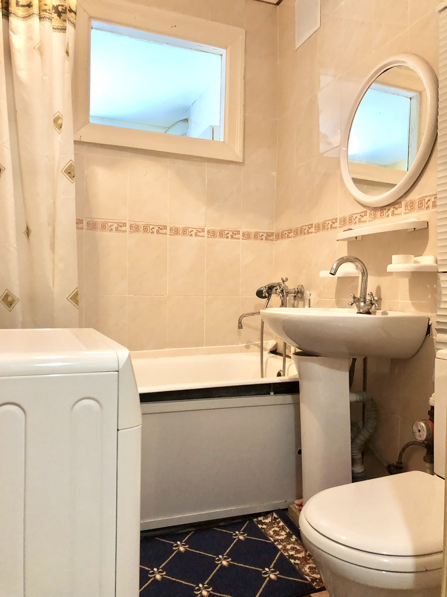 Санузел в кафеле, установлены счетчики( проведена замена стояка в ванне и электропроводки)