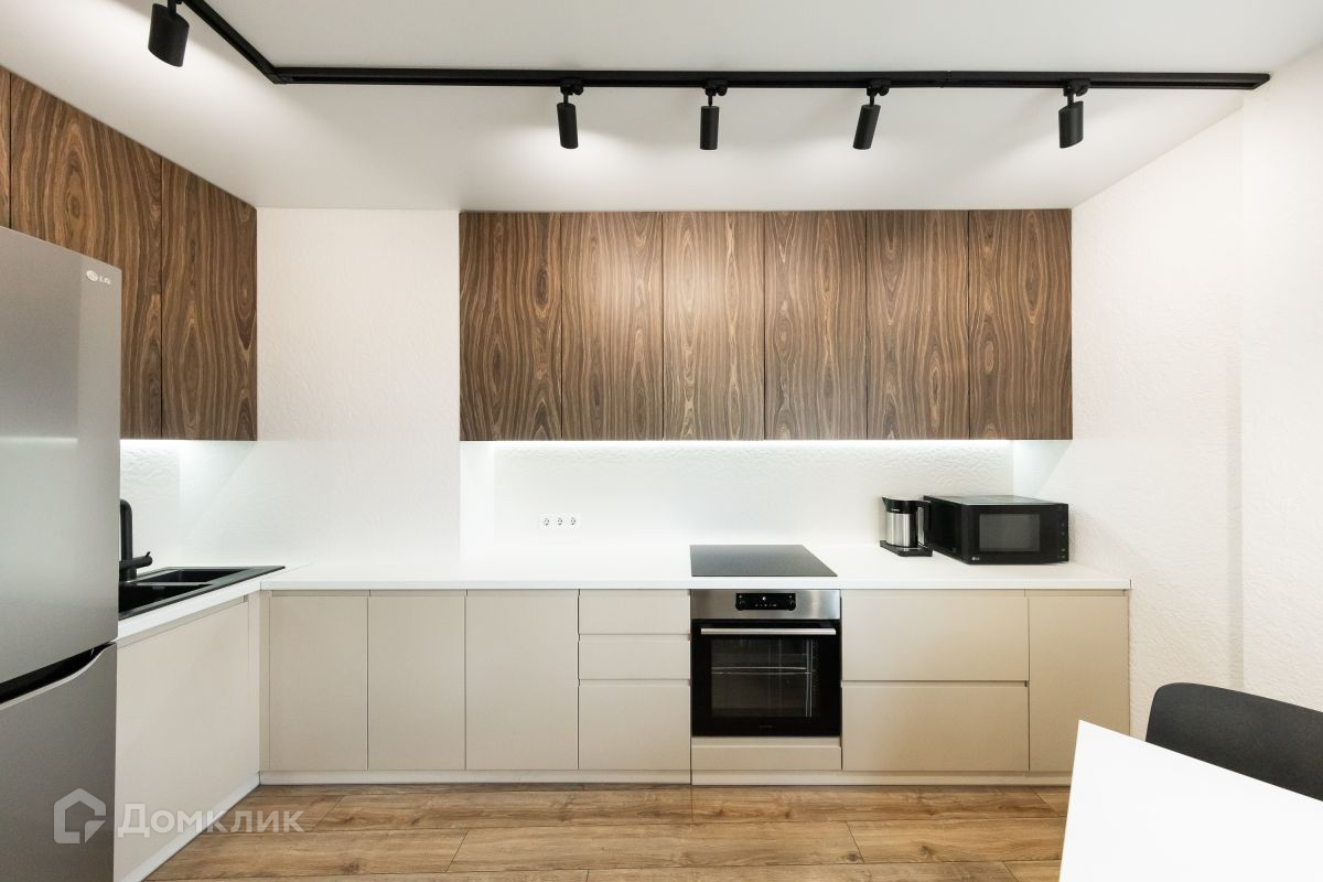 • Кухня – гостиная порадует Вас большой столешницей и вместительными шкафами. Фасады крашенные, с системой открывания фасадов Gola, которая не только экономит полезное пространство, но и очень удобна в эксплуатации.