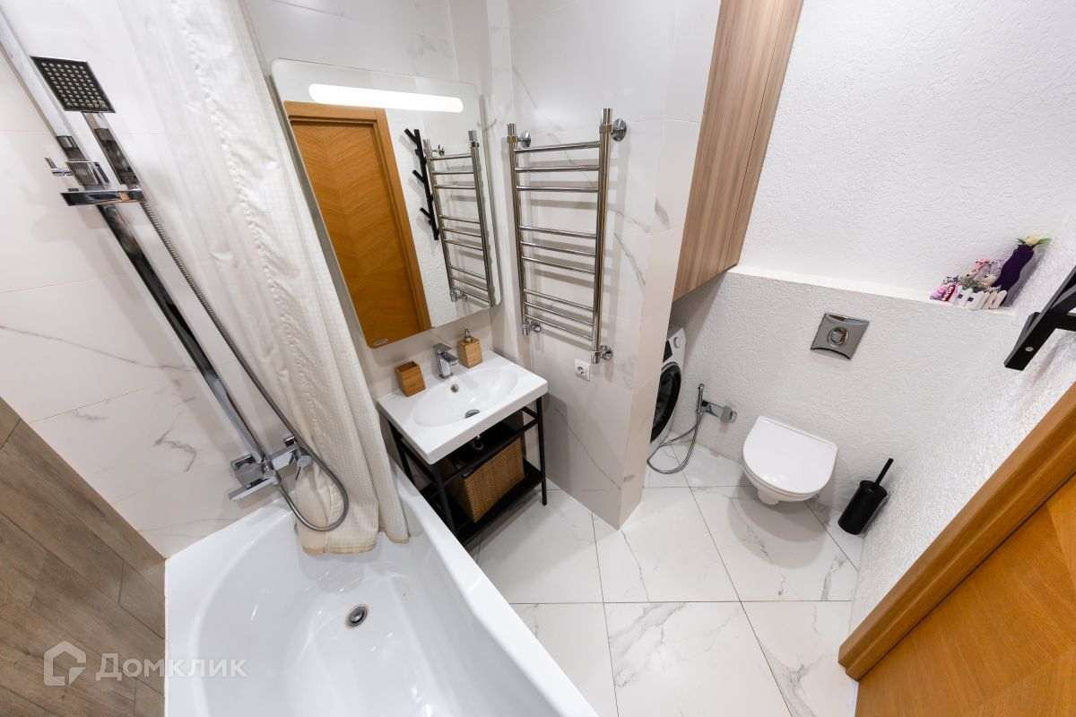 • Санузел совмещенный, просторный, установлена стиральная машинка (остается при продаже), есть гигиенический душ и бойлер на случай отключения горячей воды.