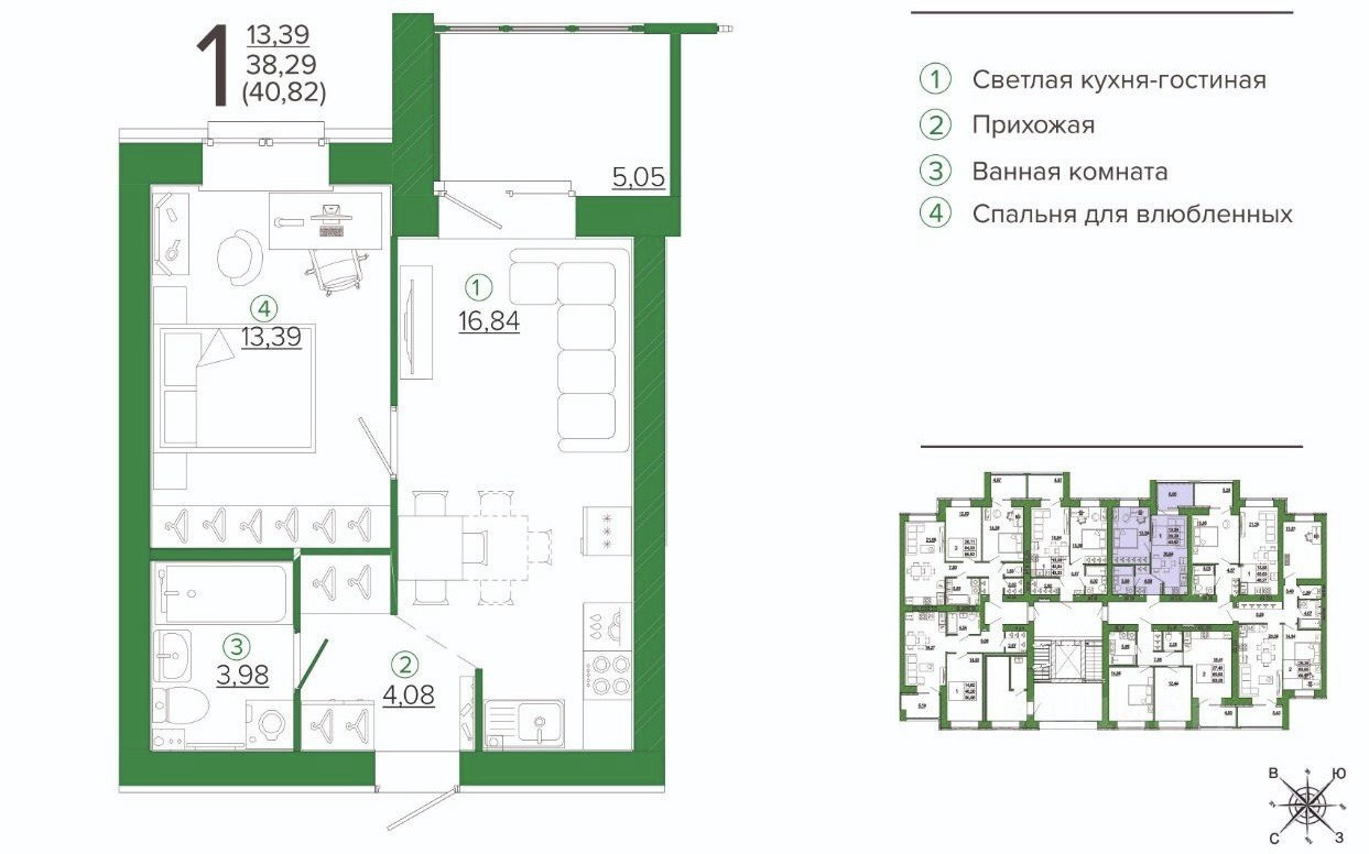 Жилая площадь составляет 13.4 квадратных метров, что позволяет организовать удобную зону для отдыха и сна. Кухня площадью 16.8 квадратных метров идеально подходит для приготовления вкусных блюд и проведения семейных ужинов. Санузел совмещённый, что является практичным решением для экономии пространства.