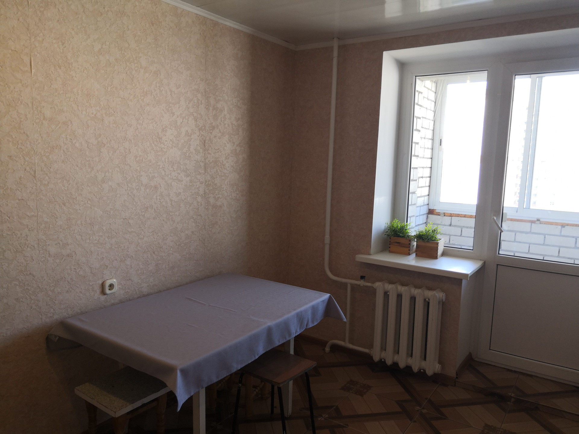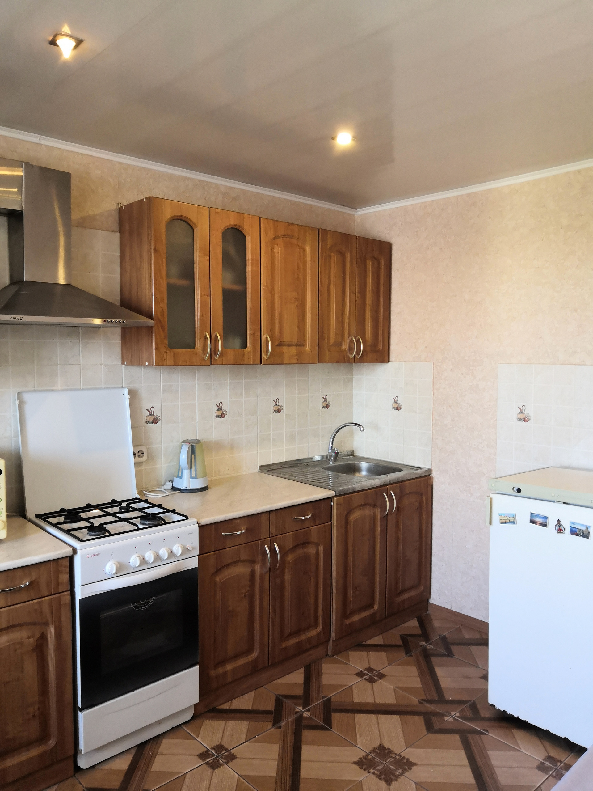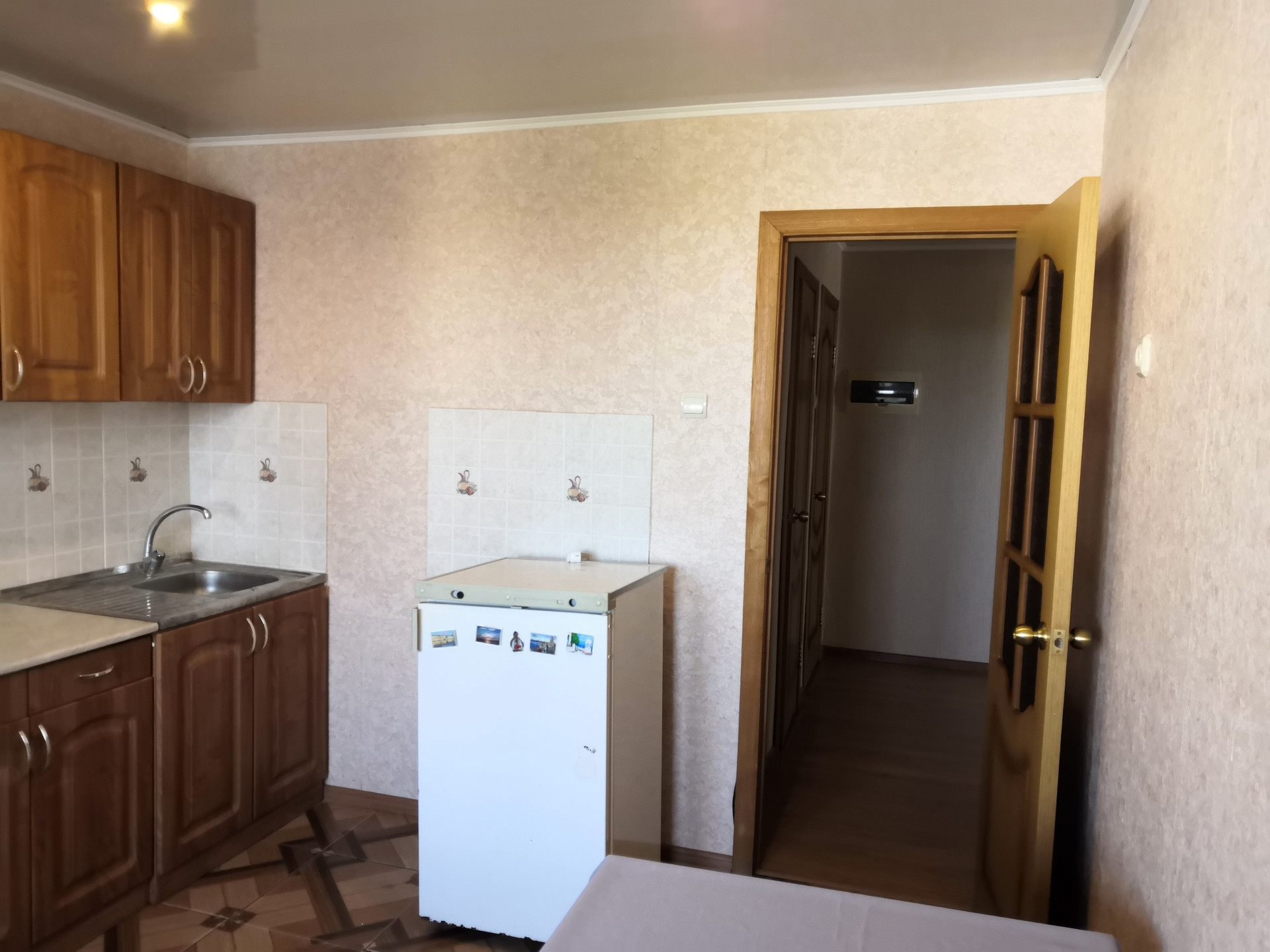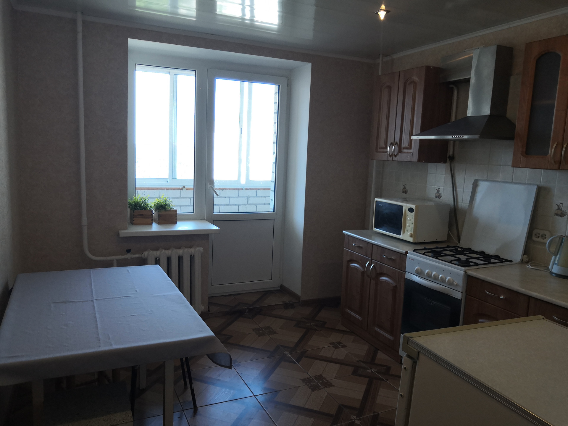 -пол выровнен и уложен ламинат, на кухне- плитка
