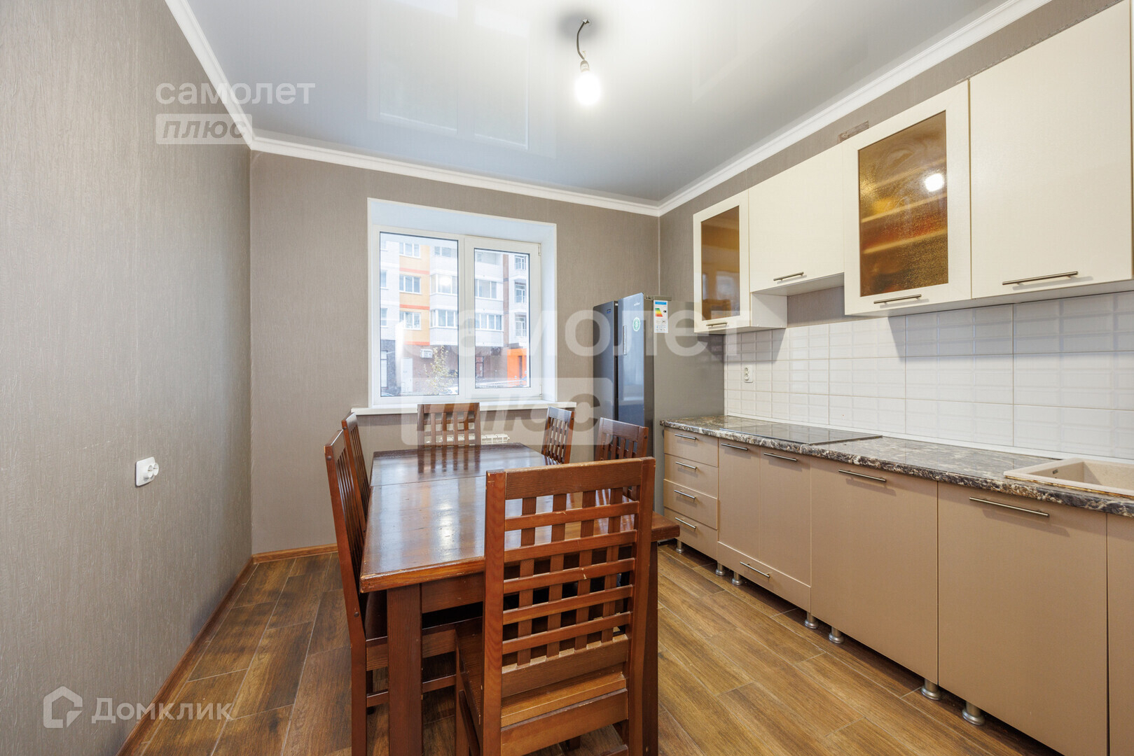 Состояние: В квартире выполнен ремонт. Остается вся мебель и техника представленная на фото. По всей квартире натяжные потолки, окна ПВХ, На полу плитка и ламинат. Санузел отделан плиткой.