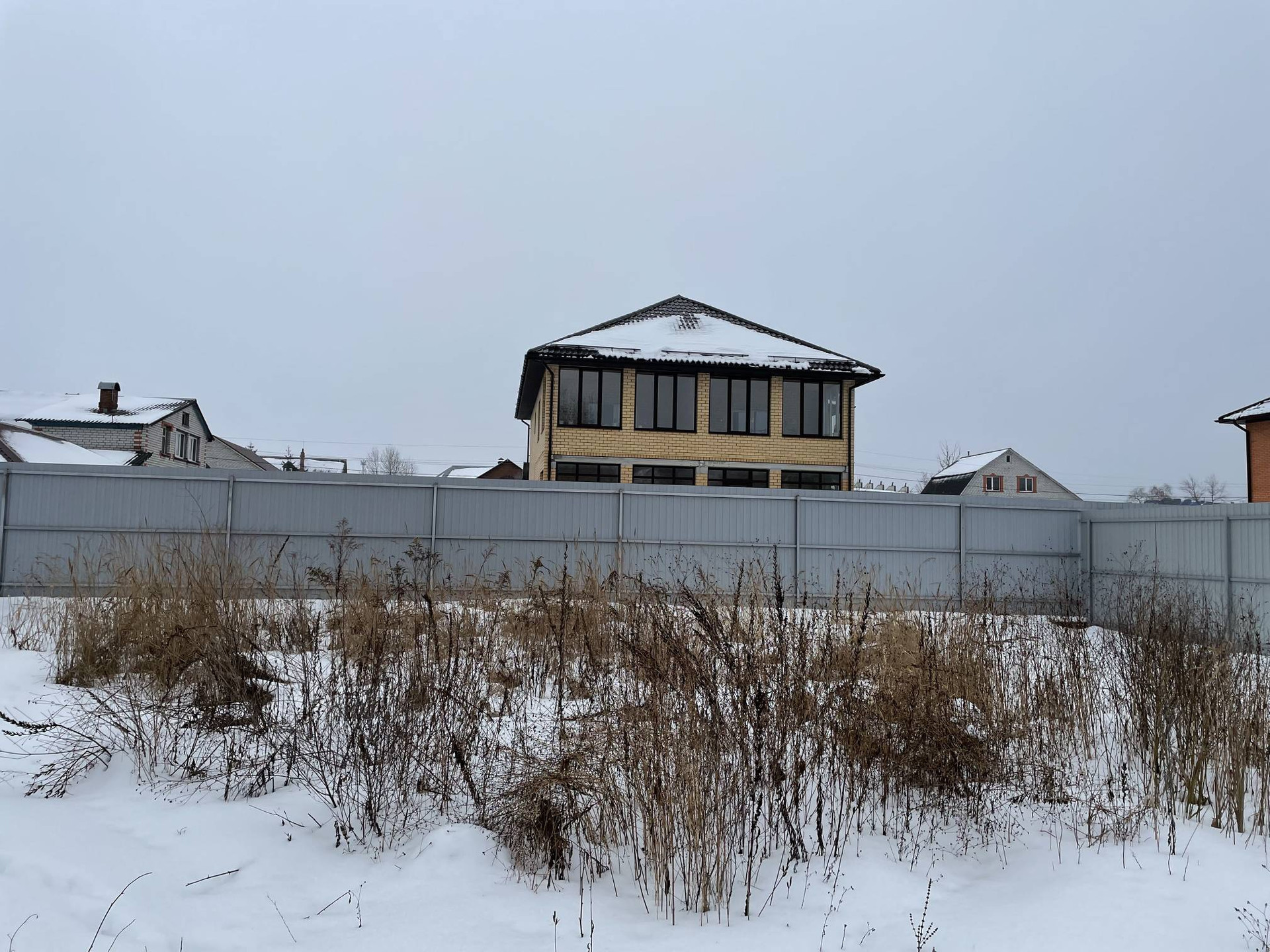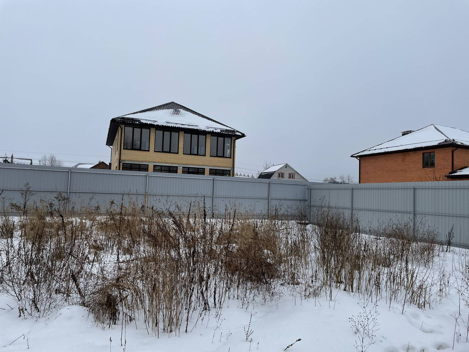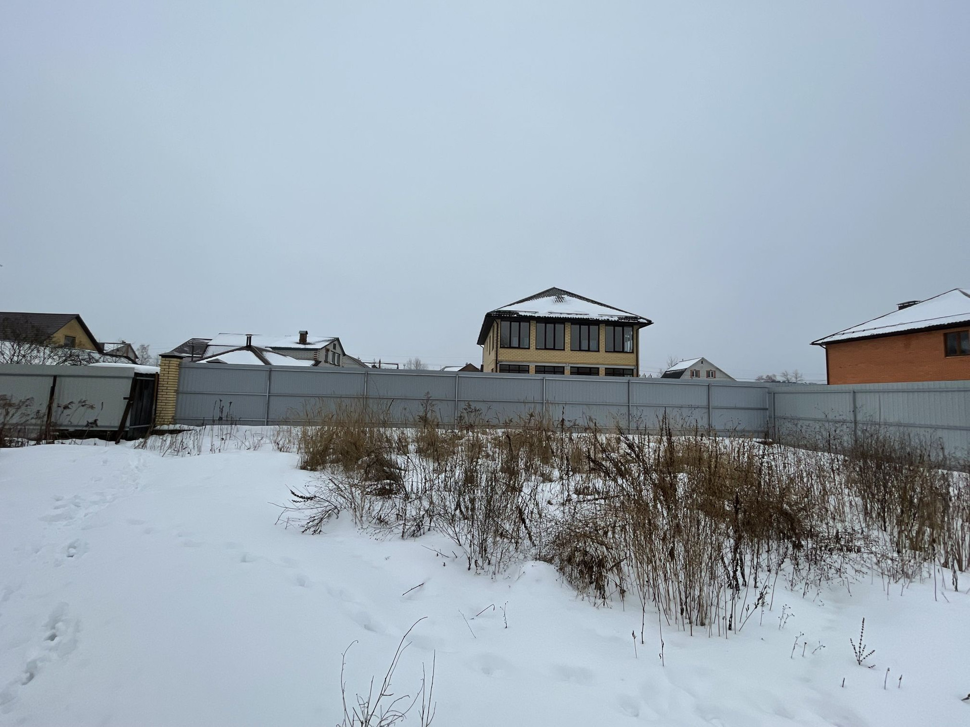 Участок с двух сторон огорожен забором из профлиста, обсыпан песком, уровень высокий.