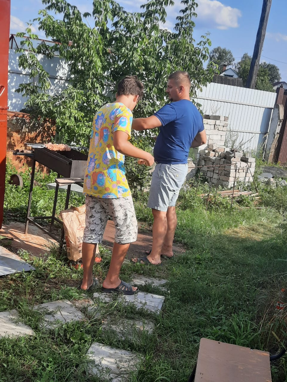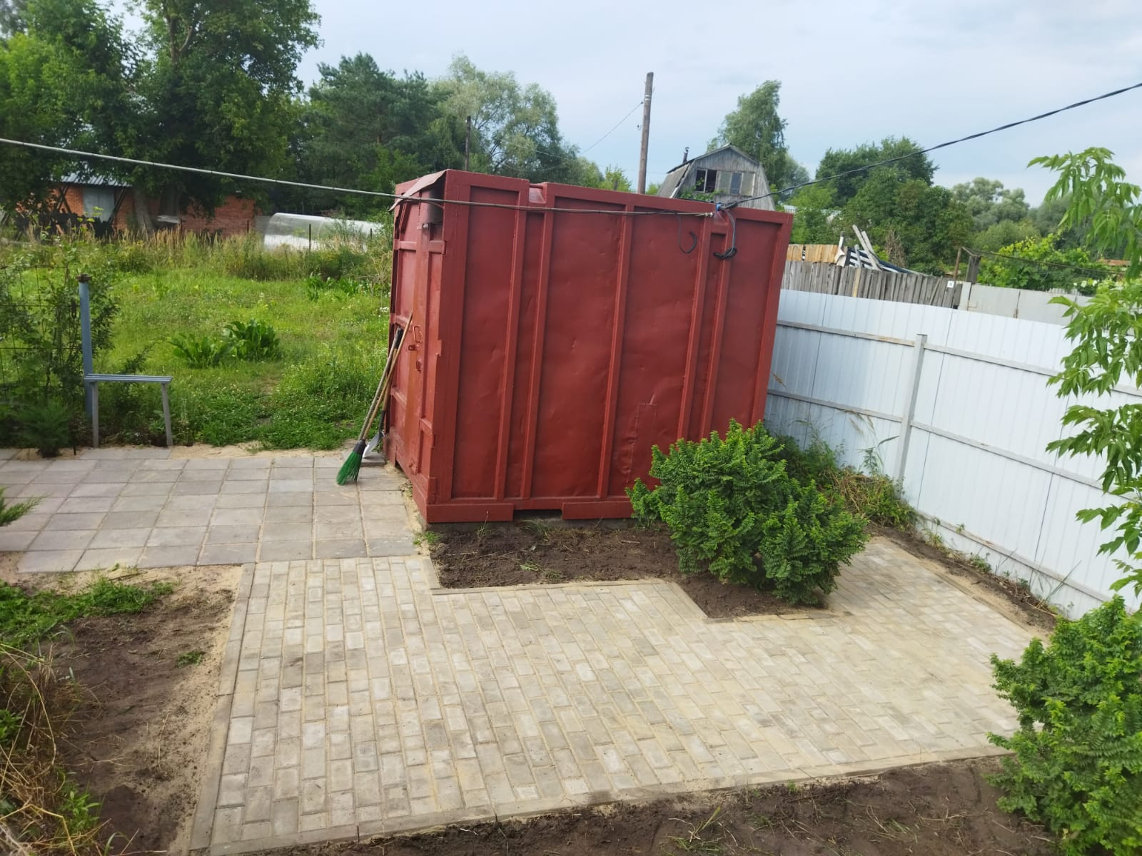 На участке контейнер, зона отдыха в плитке с беседкой и садовой мебелью, плодовые деревья, туалет. Есть железобетонные шпалы и ж/б кольцо для септика.
