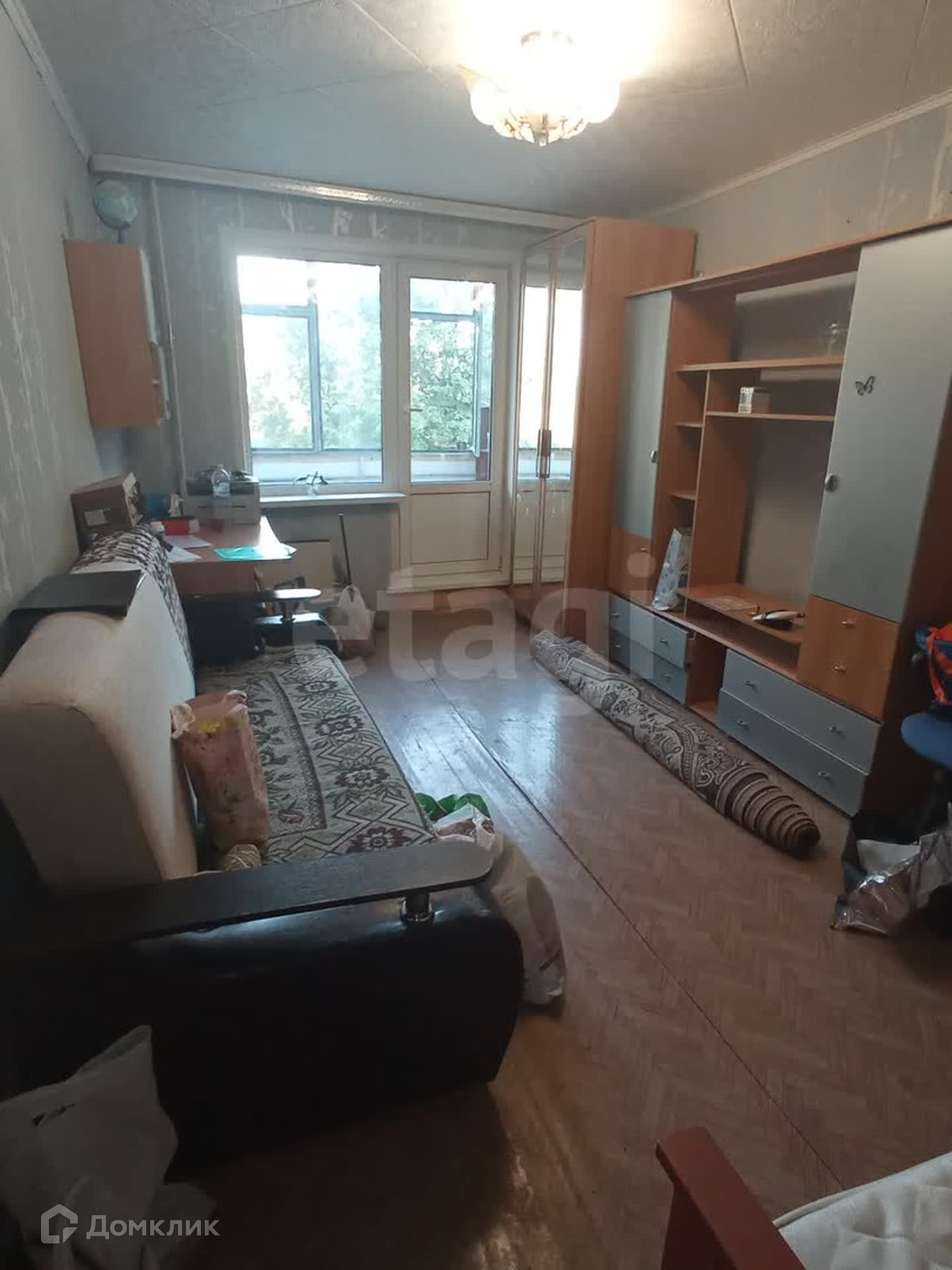 В комнате есть балкон, мебель на фото, стиральная машина, холодильник, плита.