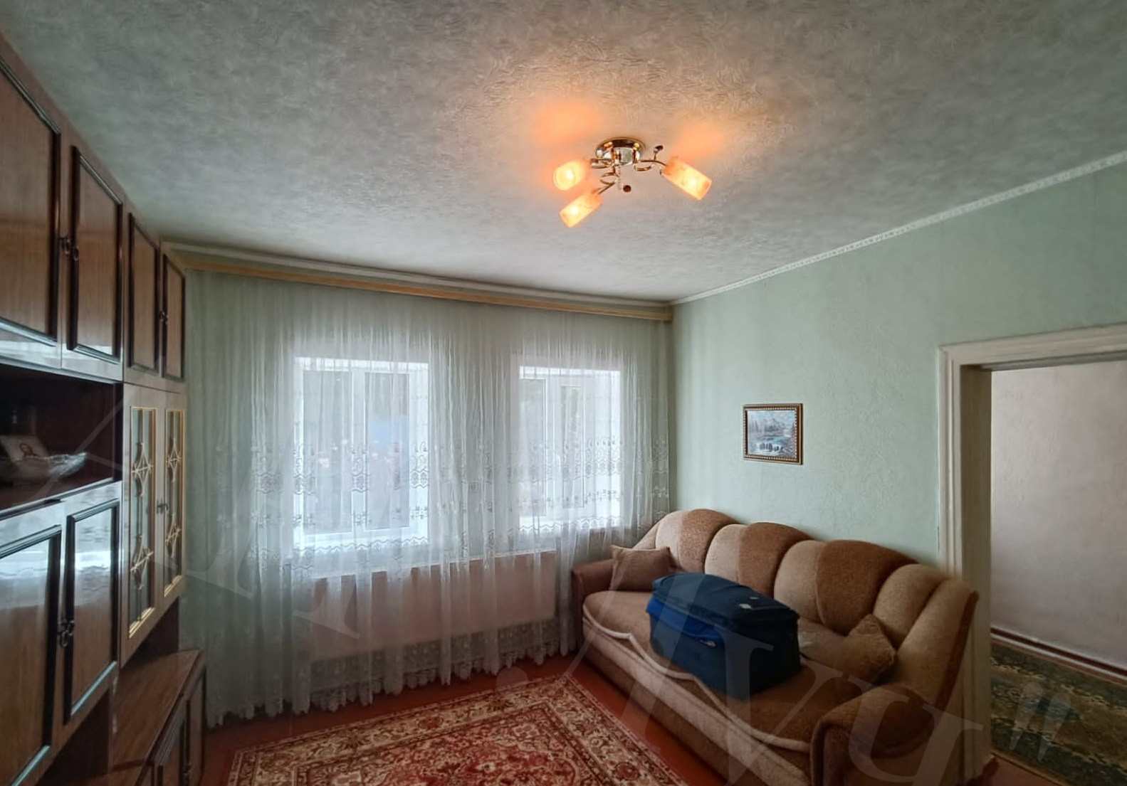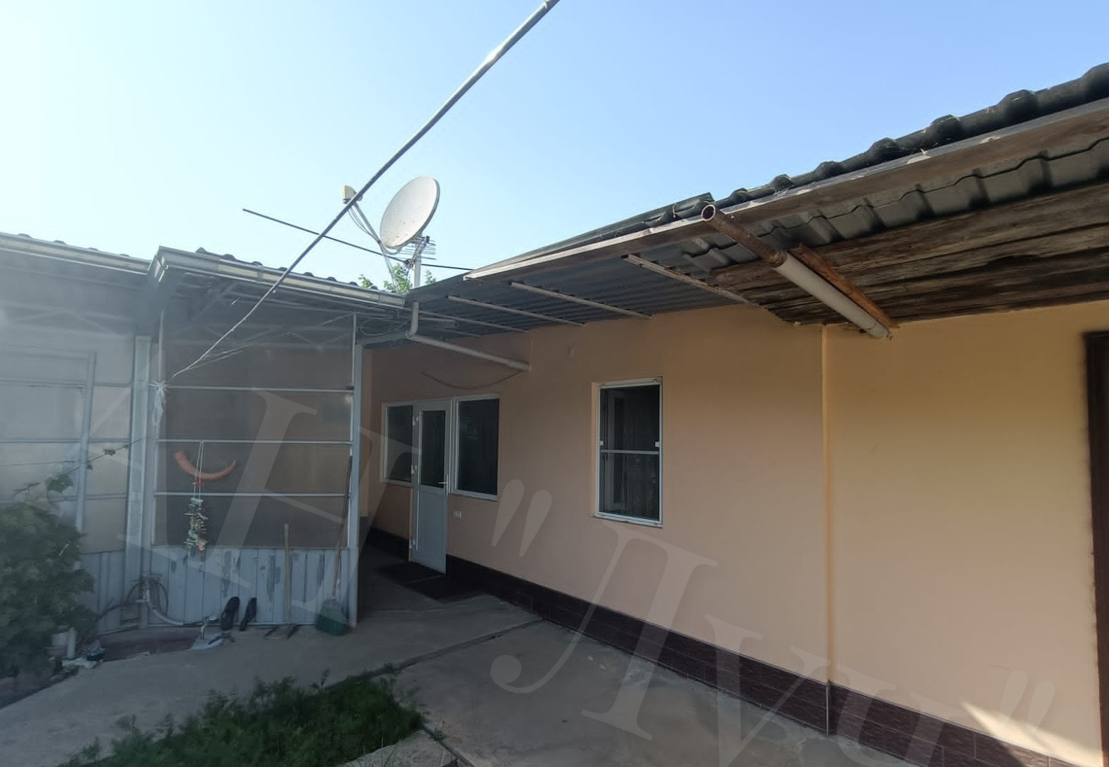 Материал стен: саман, облицован кирпичом, о/п 82,8 м2, из 3-х жилых комнат, кухня, гардеробная, котельная – кладовая, санузел совмещен.