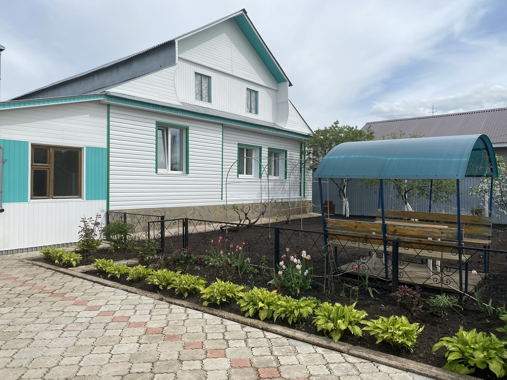 Двор выложен брусчаткой.
