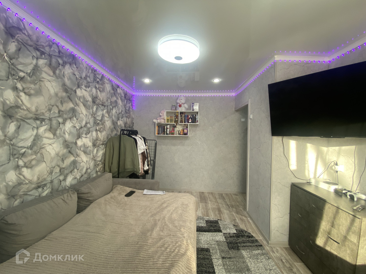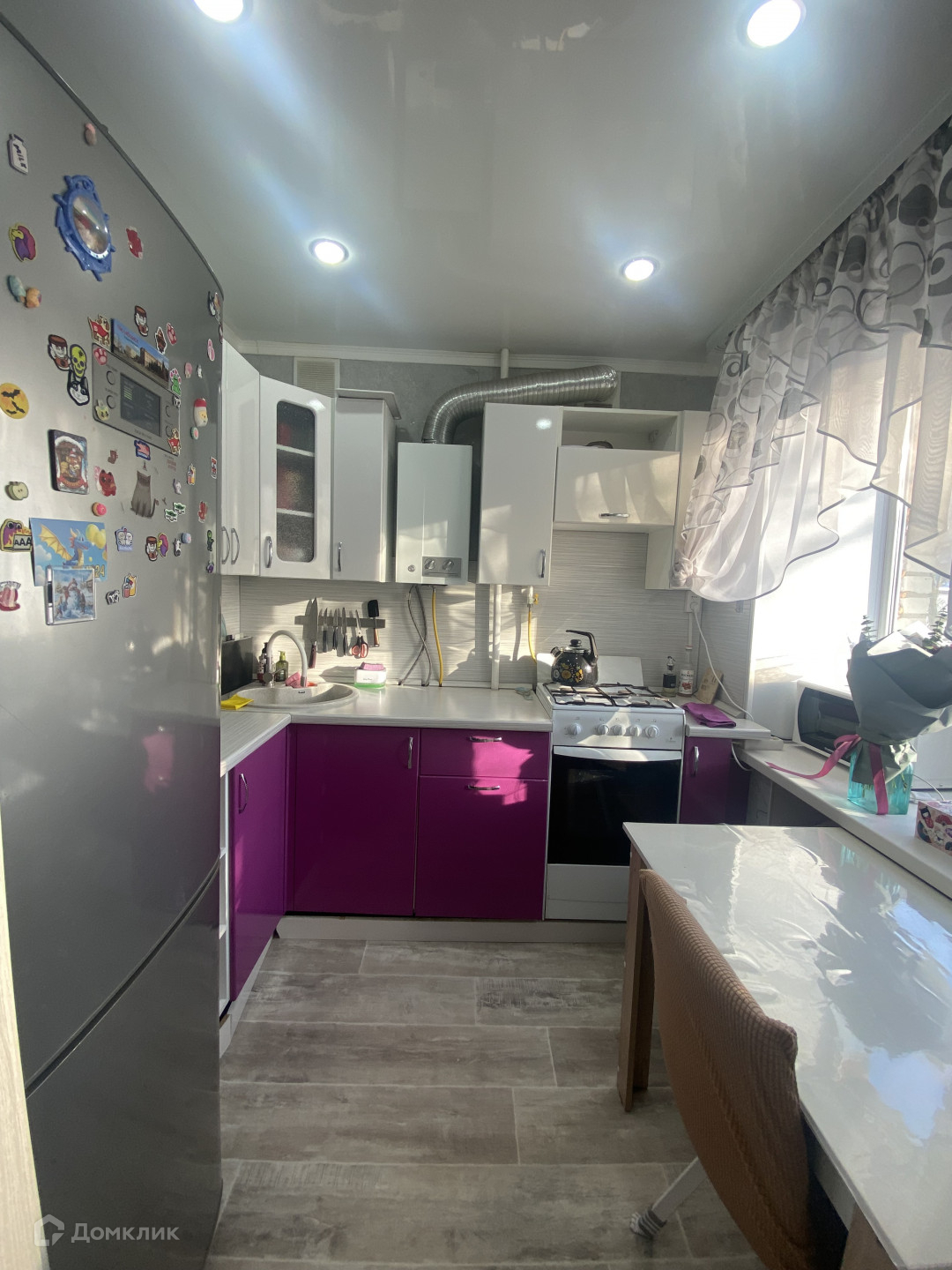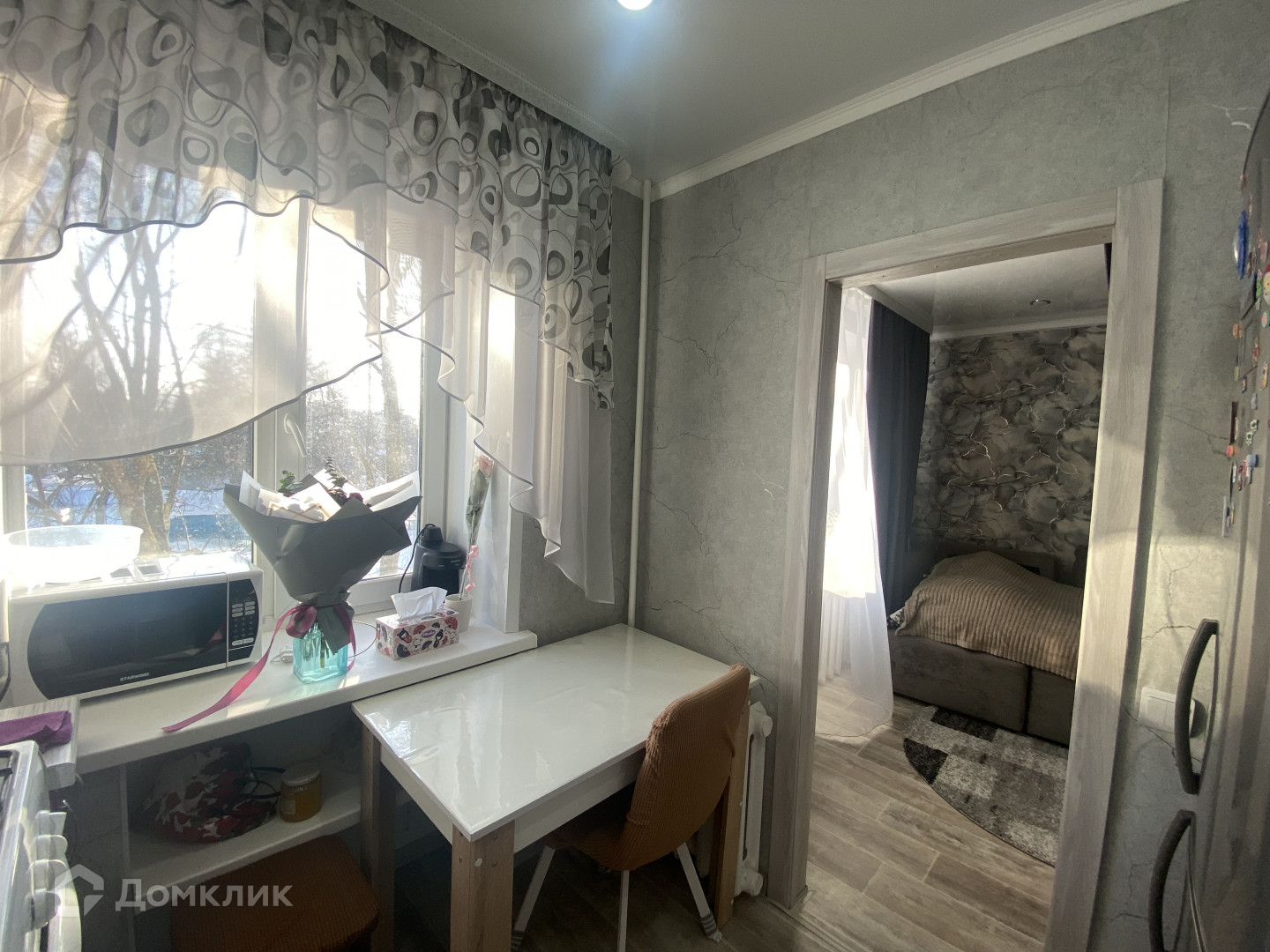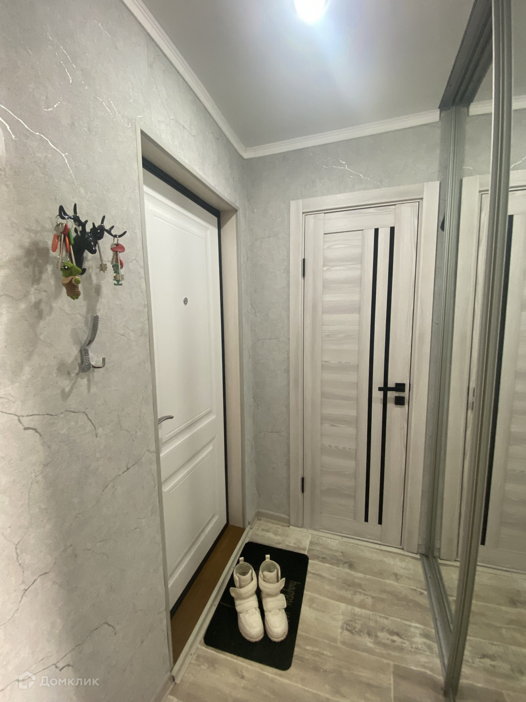 Окна пластиковые, потолки натяжные, на полу линолеум. Входная и межкомнатные двери хорошие. В ванной пластиковые панели. В прихожей большой и вместительный шкаф-купе. Он останется . В кухне остается кухонный гарнитур.