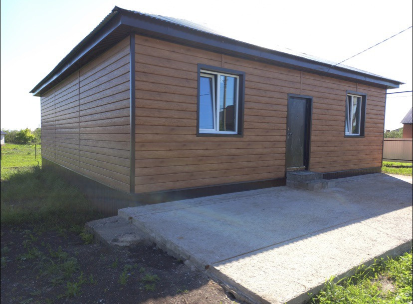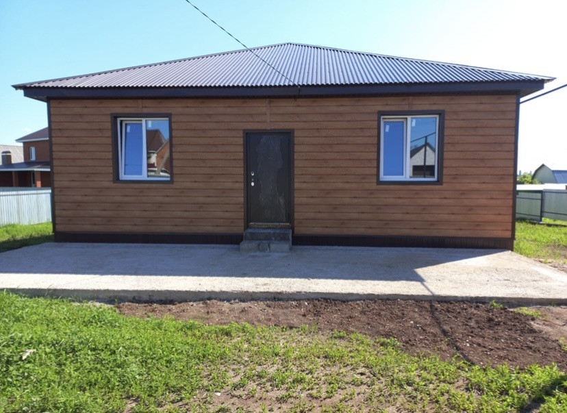 Дом построен из шлакоблока в 2021 году, утеплён и обшит металлосайдингом, подвал под домом 105 кв.м., стены отштукатурены под маяк, коммуникации подключены (газ, свет, вода), выгребная яма, есть настенный газовый котёл, стоят счётчики на воду, газ, свет