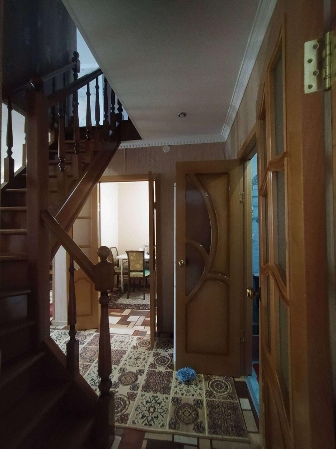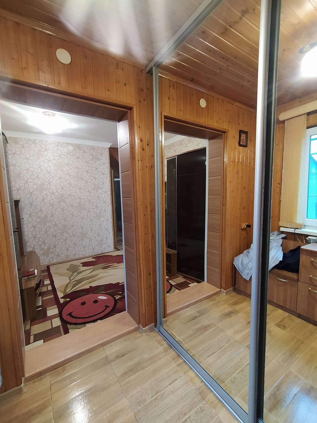 Дом из бревна обложен кирпичом и обшит сайдингом, зимой очень тепло, летом сохраняется прохлада. Заходя в дом мы видим встроенную просторную , вместительную гардеробную с большими зеркальными дверями купе, далее хол ( комната отдыха) со