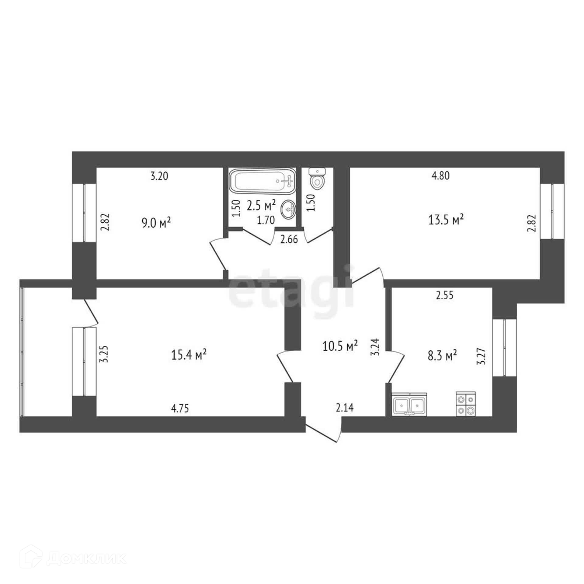 Общая площадь 60.5 м2