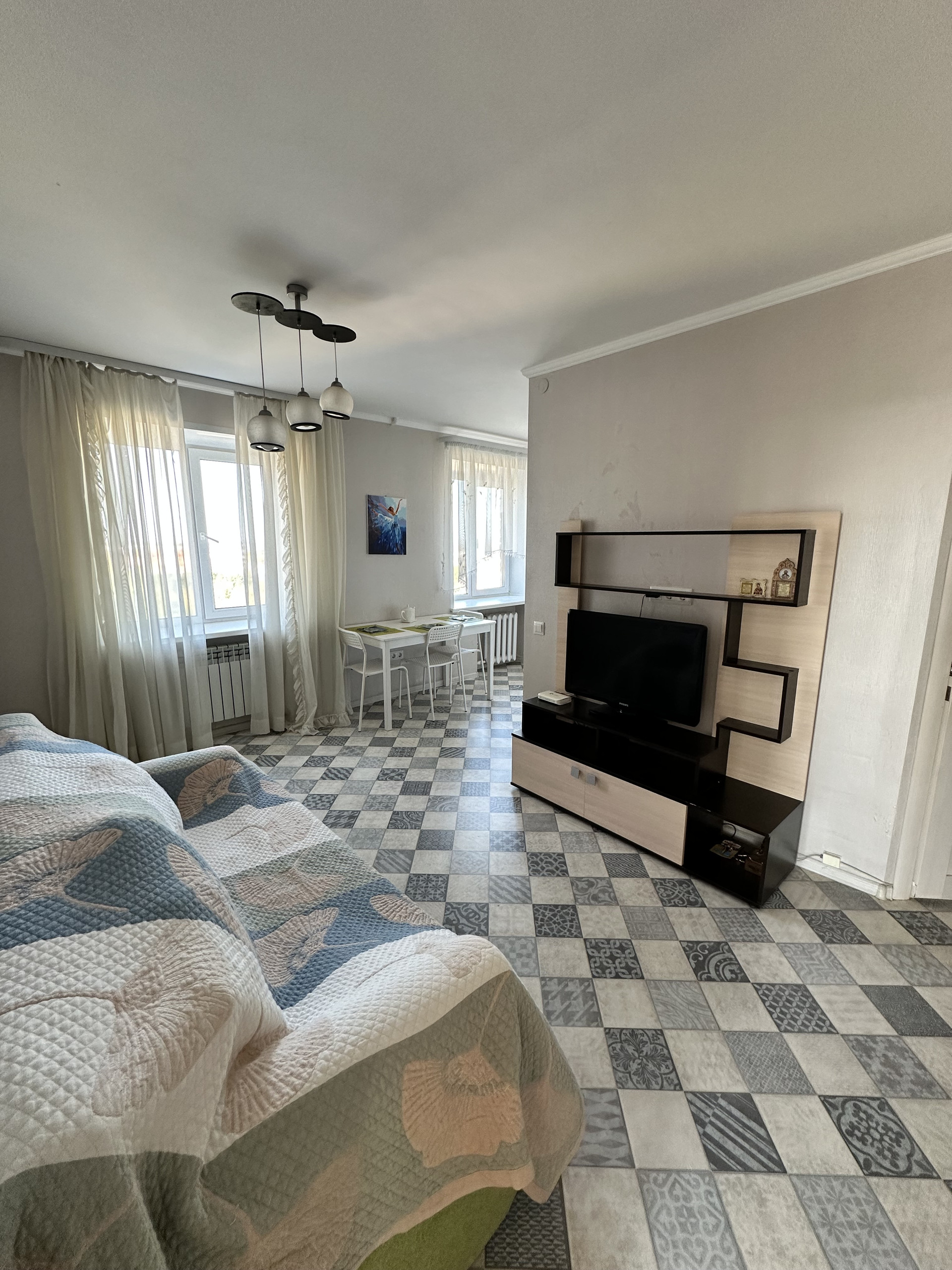светлая кухня 6 кв.м совмещенная с гостиной 15 кв.м., жилая комната 13,4 кв.м, санузел совмещенный 5 кв.м, просторная лоджия 8 кв.м и кладовая 2 кв.м. Сделан евроремонт с использованием качественных материалов в светлых спокойных тонах без акцентов, это делает интерьер уютным и идеальным для любого сценария жизни. Смотровая квартира на 8ом этаже, открывается вид на весь город, красивые закаты и рассветы.