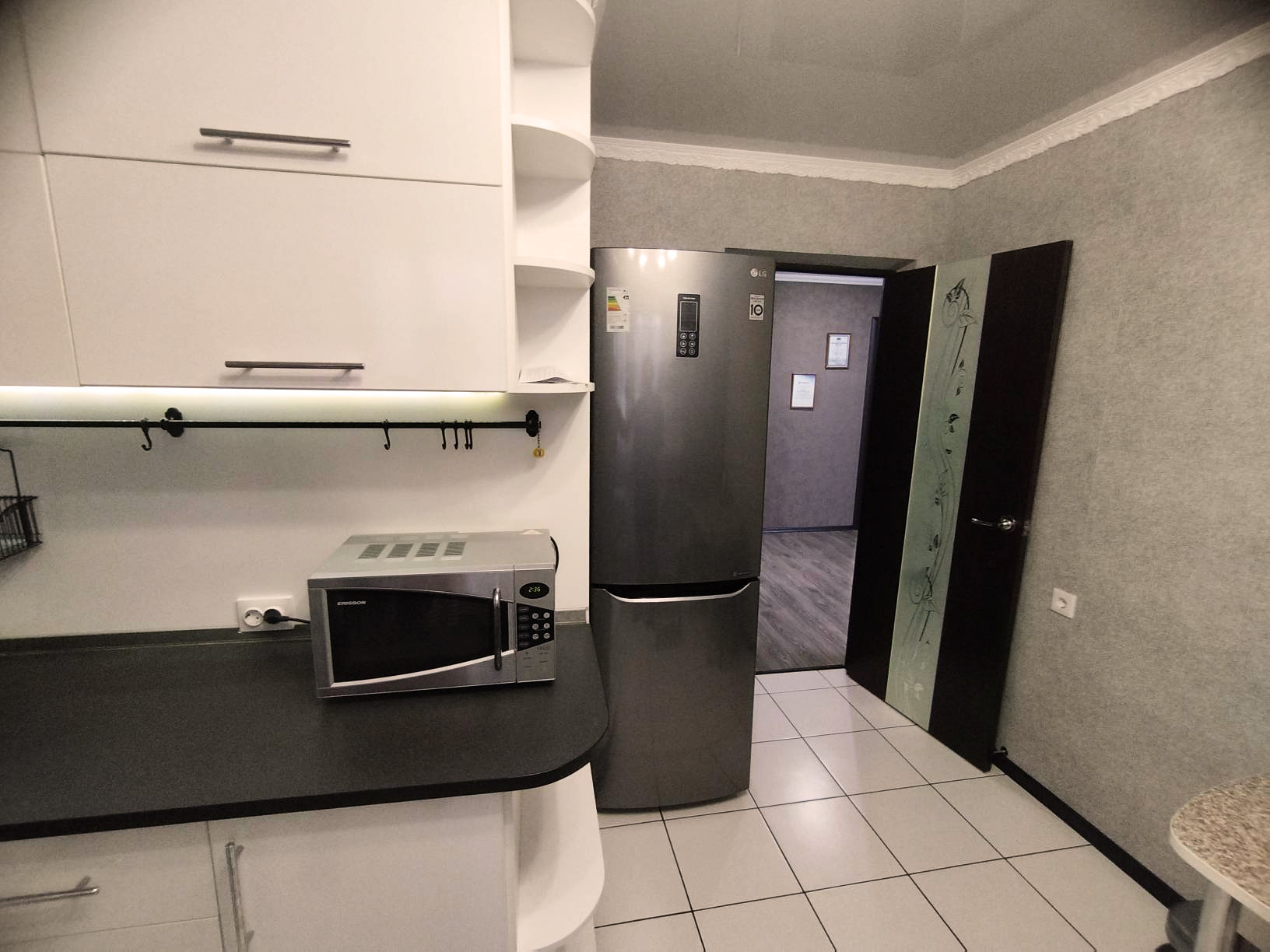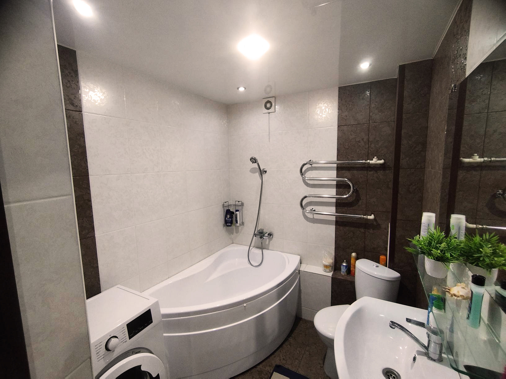 Во всей квартире натяжные потолки и яркий свет.