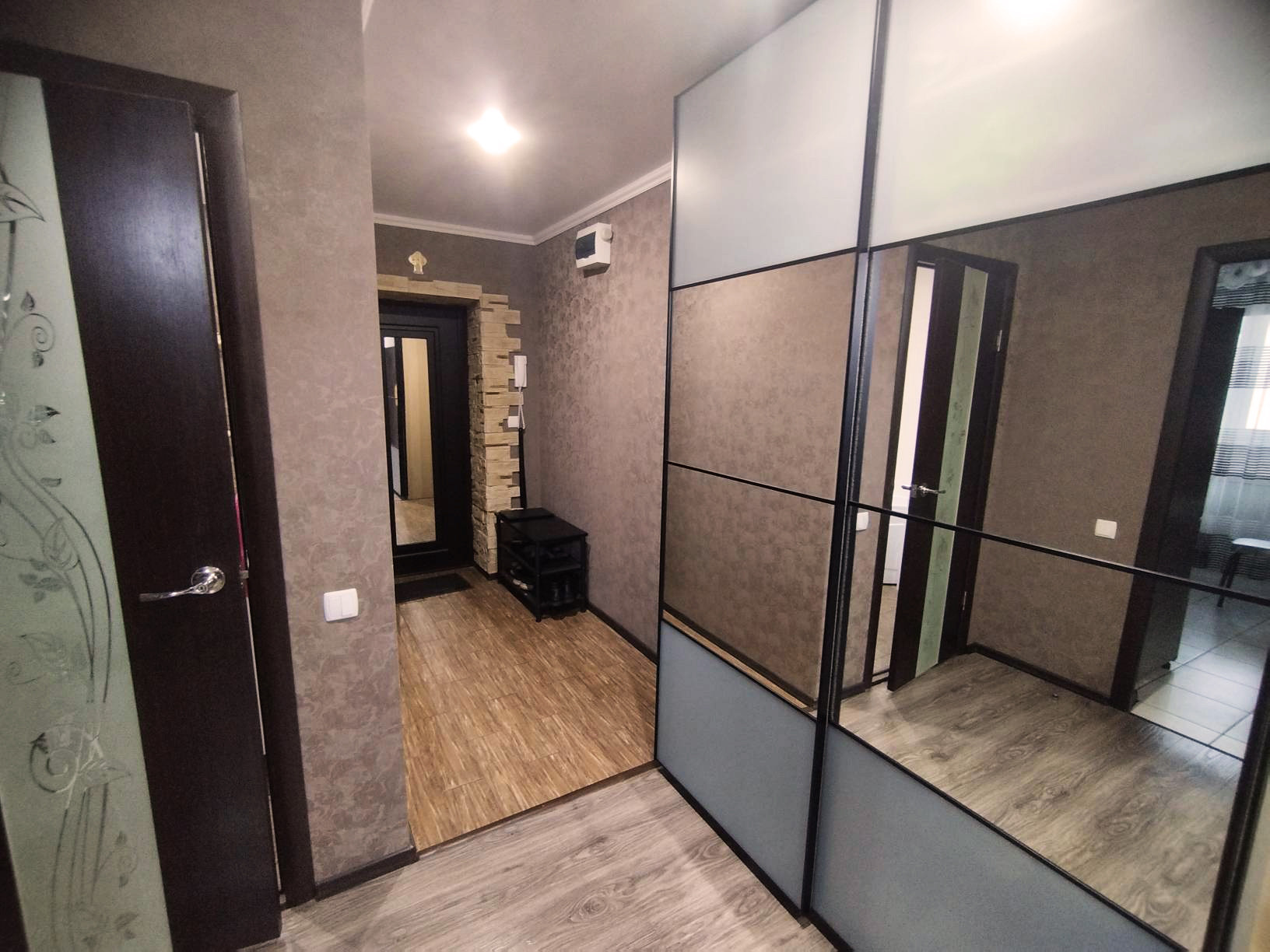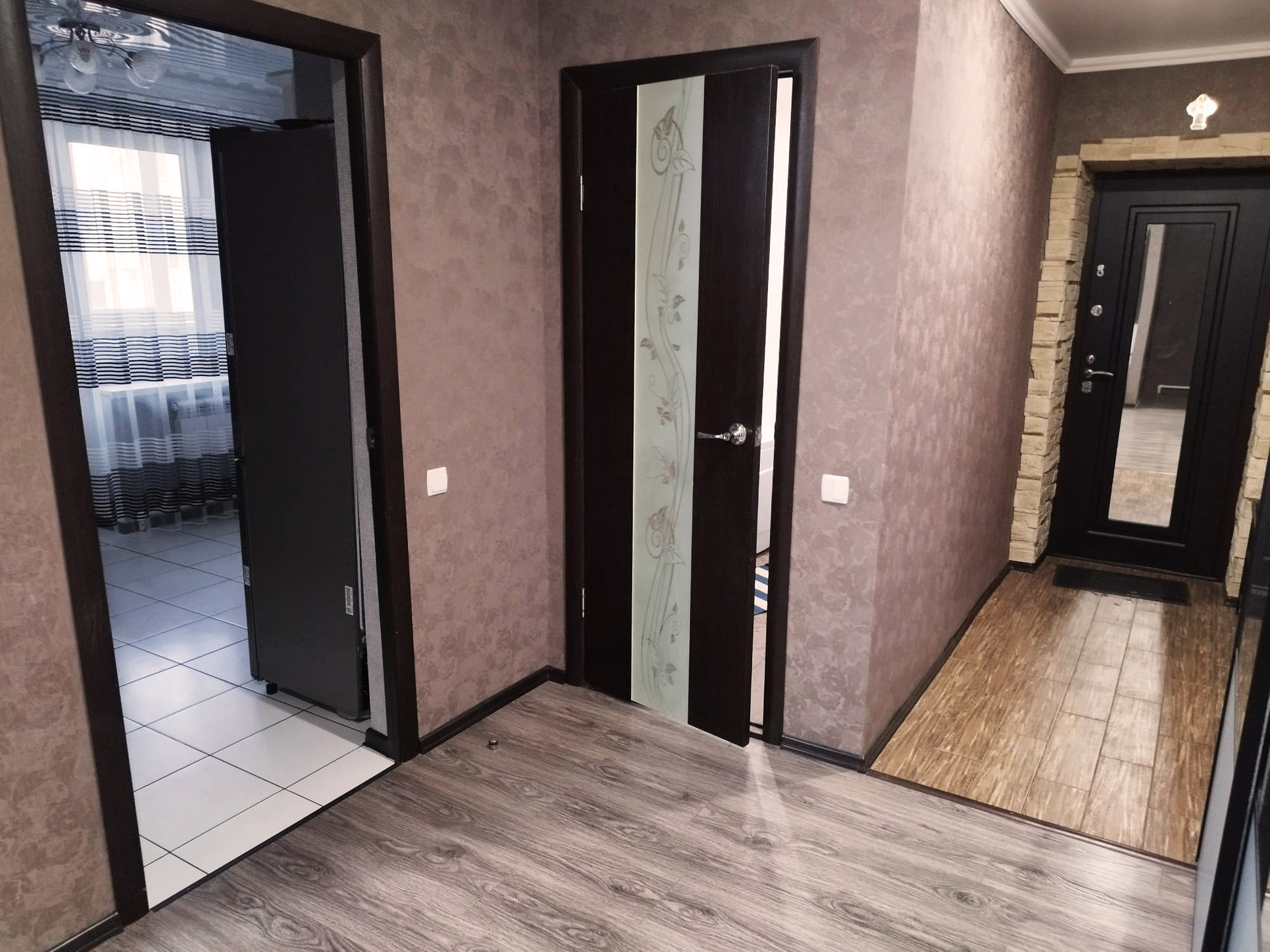 Ламинат благородных темных оттенков лежит в жилых зонах. В ванной и коридоре - плитка.