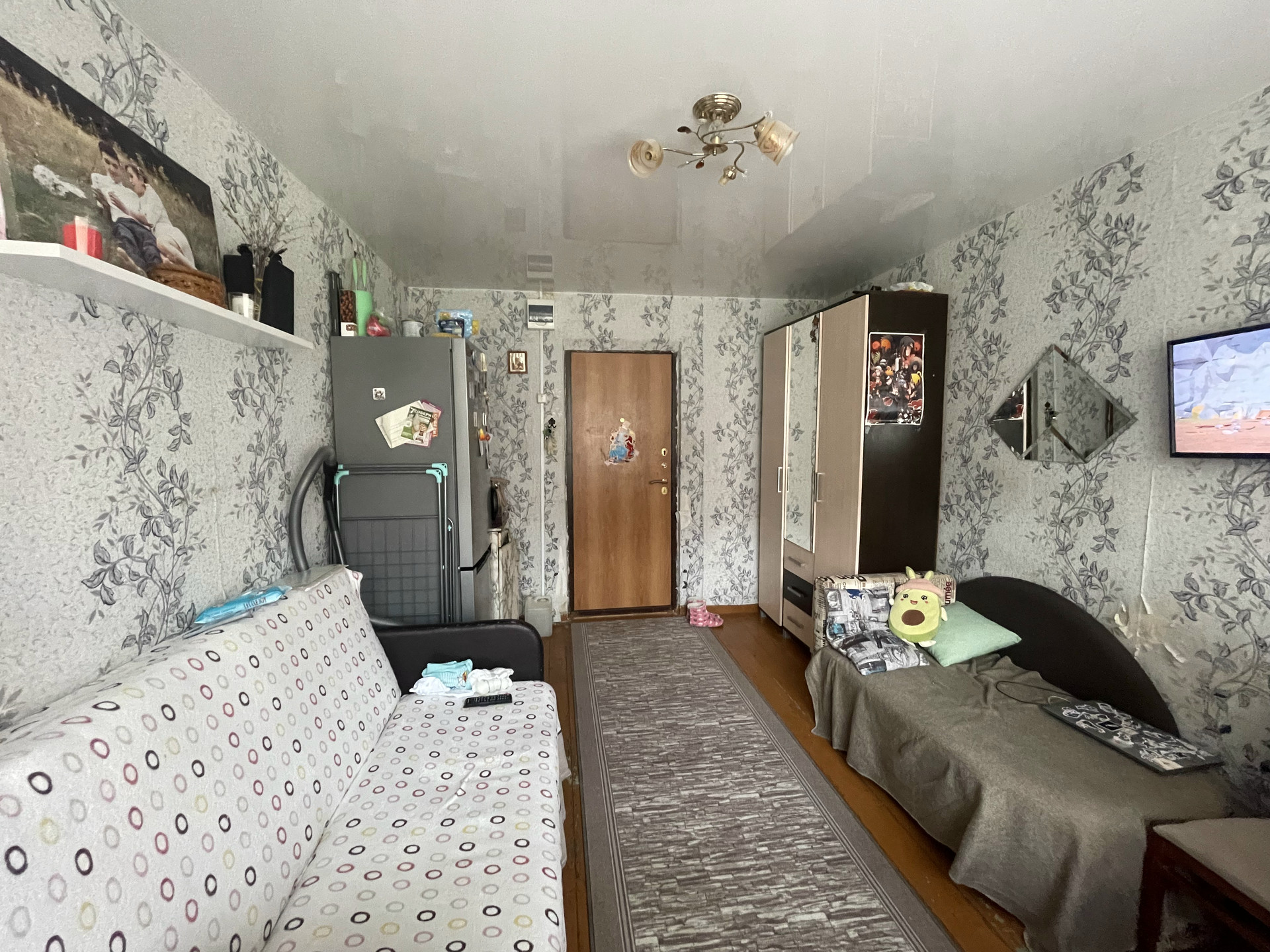 Комната с косметическим ремонтом (пластиковое окно, натяжной потолок, железная входная дверь). Соседей всего двое. Кухня и сан.узел в приличном состоянии. Есть дополнительные места для хранения. Один взрослый собственник.