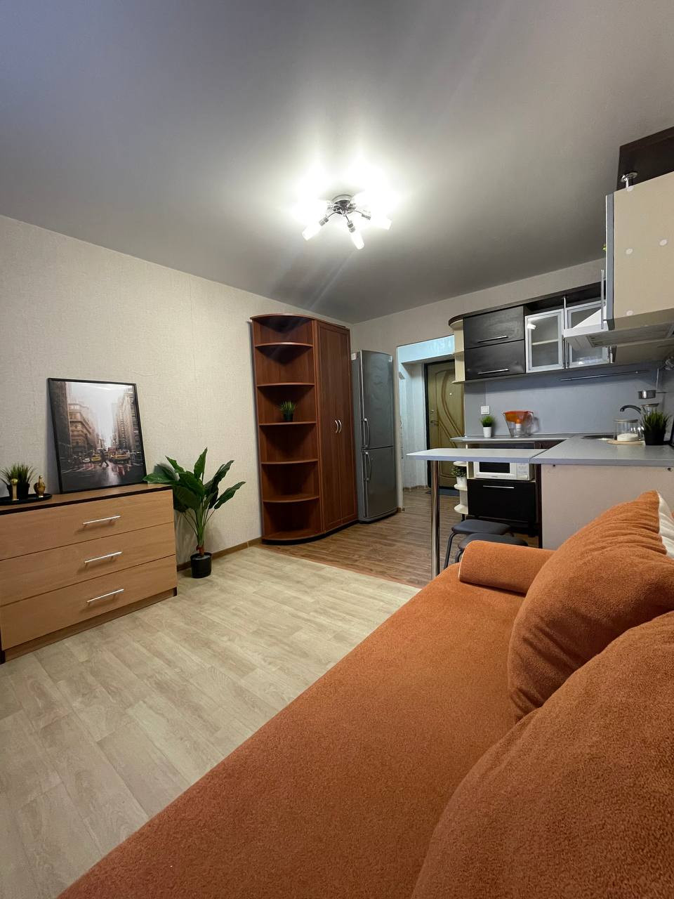 В комнате установлена железная дверь. Окно пластиковое, натяжные потолки, встроенная кухня. Счетчики на свет, воду.
