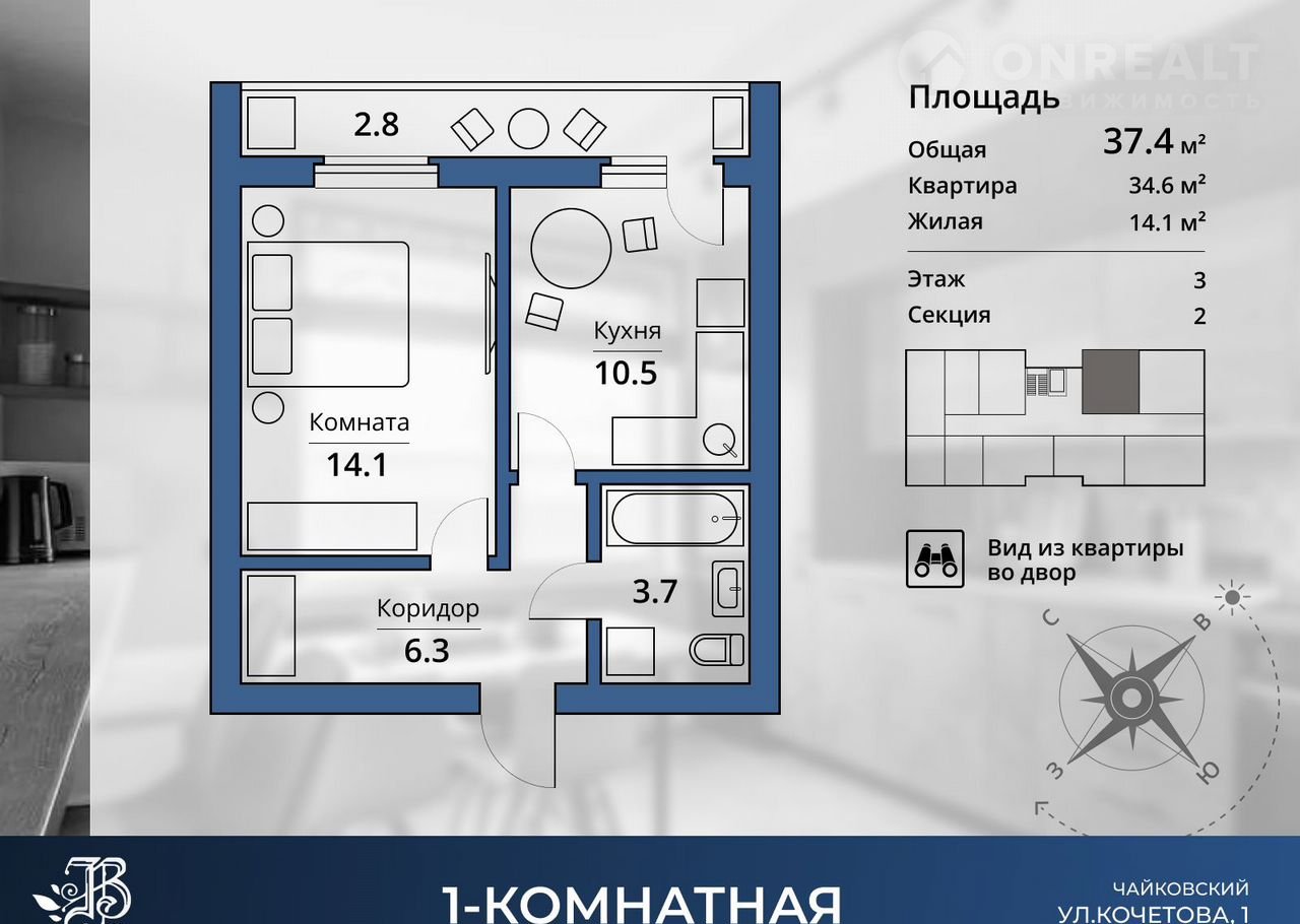 1-комнатная квартира, 37.4 м2, этаж 3 / 9, на продажу в Чайковском, улица Кочетова, 1