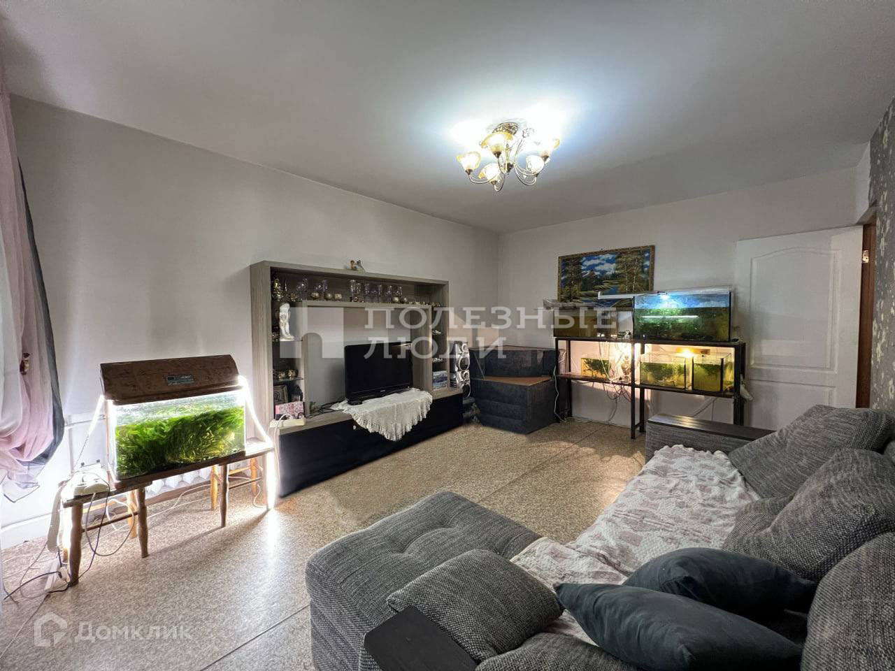 Кухня и коридор напольное покрытие - плитка, гостиная - линолеум, спальня и 2 детские - ламинат.