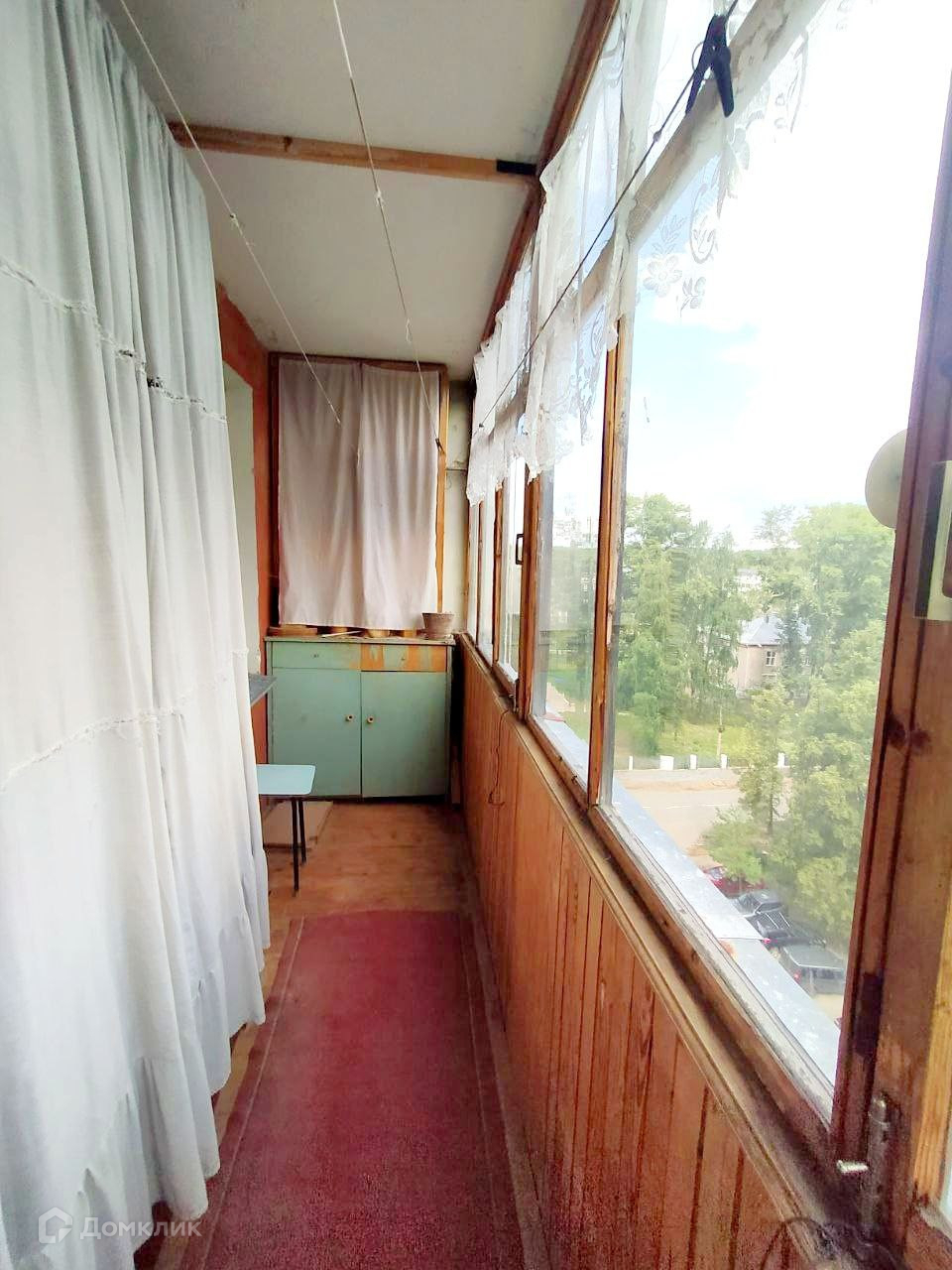 Большая лоджия на два окна застеклена деревянными рамами