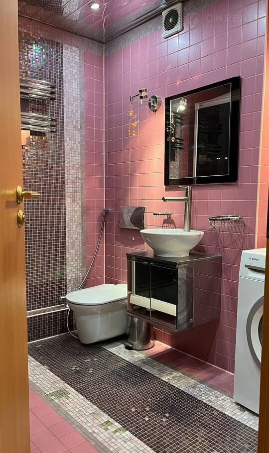 Первый санузел оформлен в красивом перламутрово-пудровом цвете. Душевая-кабина со стеклянными дверцами и душевой системой, подвесной унитаз с инсталляцией и гигиенической лейкой, качественная сантехника.