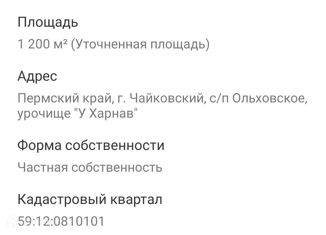 ### Земельный участок 12сот. - с/п Ольховское, урочище "У Харнав" . Кадастравый номер участка 59:12:0810101:473. Лот №393147 |